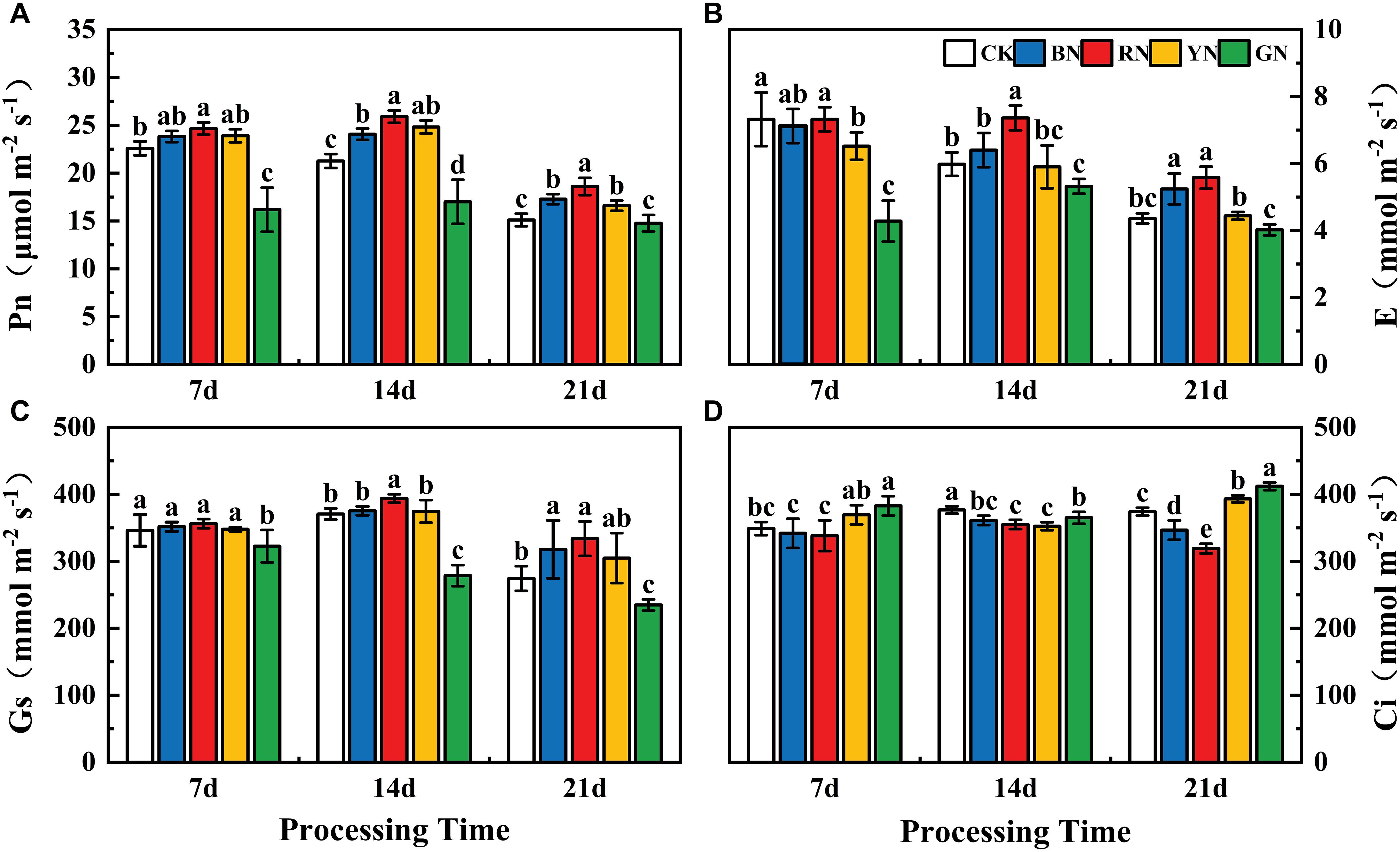 Photo-selective shade nets effectively influenced the gas exchange parameters of adzuki bean leaves. Pn, Tr and Gs exhibited a pattern of initial increase followed by a decrease as the treatment duration progressed. At 7 d after treatment, Pn, Tr and Gs did not differ significantly among the treatments, with the highest values observed under RN treatment, followed by BN and YN. At 14 d after treatment, the highest level was observed, where Pn, Gs, and Tr in the RN treatment were significantly higher than other treatments, showing to be increased by 21.83%, 6.26%, and 23.08% relative to CK, respectively (Figures 4A–C). At 21 d after treatment, Pn, Gs, and Tr in RN and BN treatments were significantly higher than CK, increasing by 23.18%, 15.82%, 27.98% and 14.44%, 21.65%, 20.18%, respectively, whereas those in GN treated plants decreased by 2.25%, 14.43%, and 7.80% relative to CK, respectively (Figures 4A–C). The trend of Ci was opposite to those of Pn, Tr, and Gs. It reached the peak under YN treatment and the lowest level under RN treatment, indicating that the opening of stomata induced by RN more effectively that promotes CO2 assimilation, thereby increasing the Pn (Figure 4).