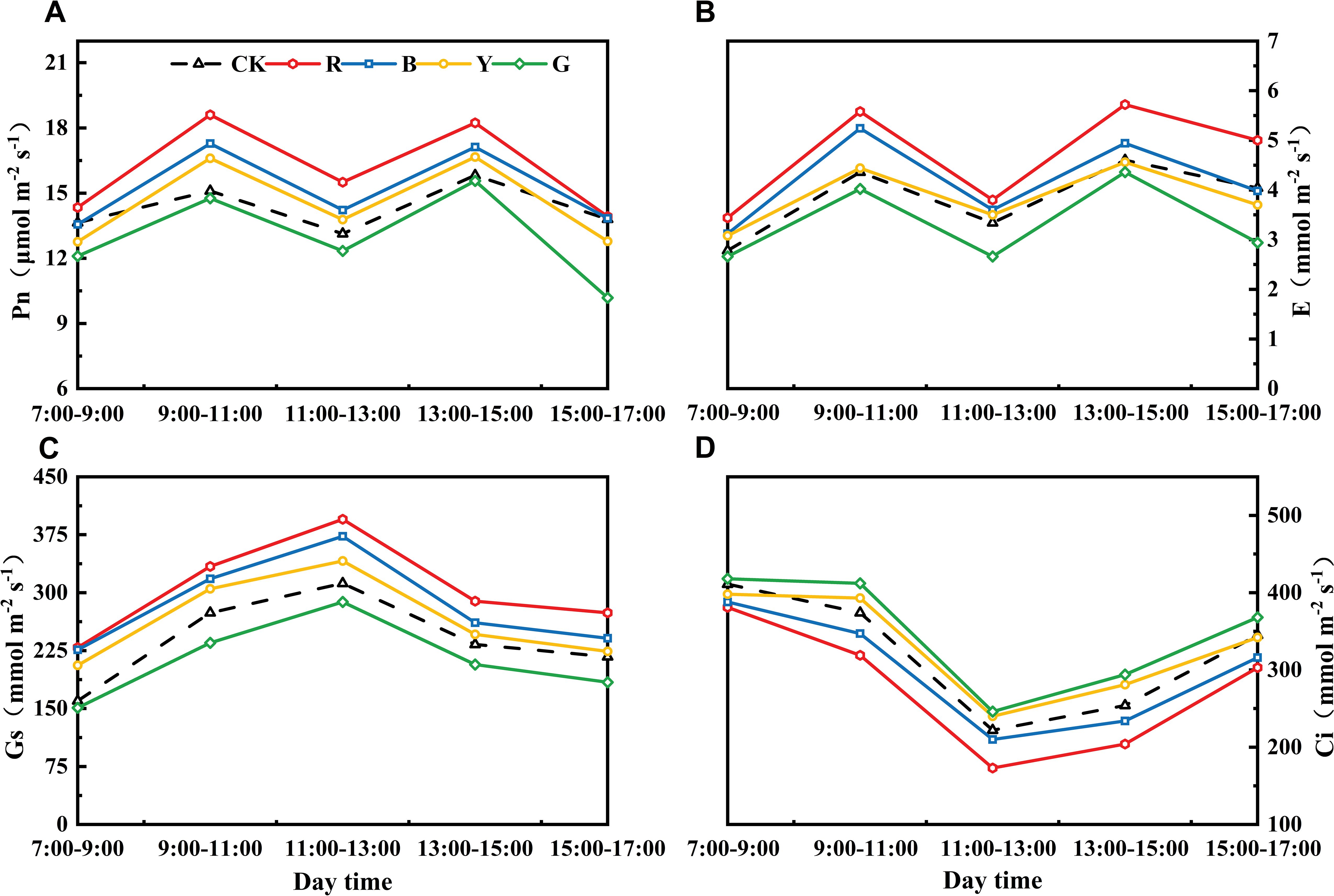 Figure 5. Effects of photo-selective nets on diurnal variation in photosynthetic parameters of adzuki bean leaves after 21 days of treatment. (A) Net photosynthetic rate (Pn). (B) Transpiration rate (E). (C) Stomatal conductance (Gs). (D) Intercellular CO2 concentration (Ci).