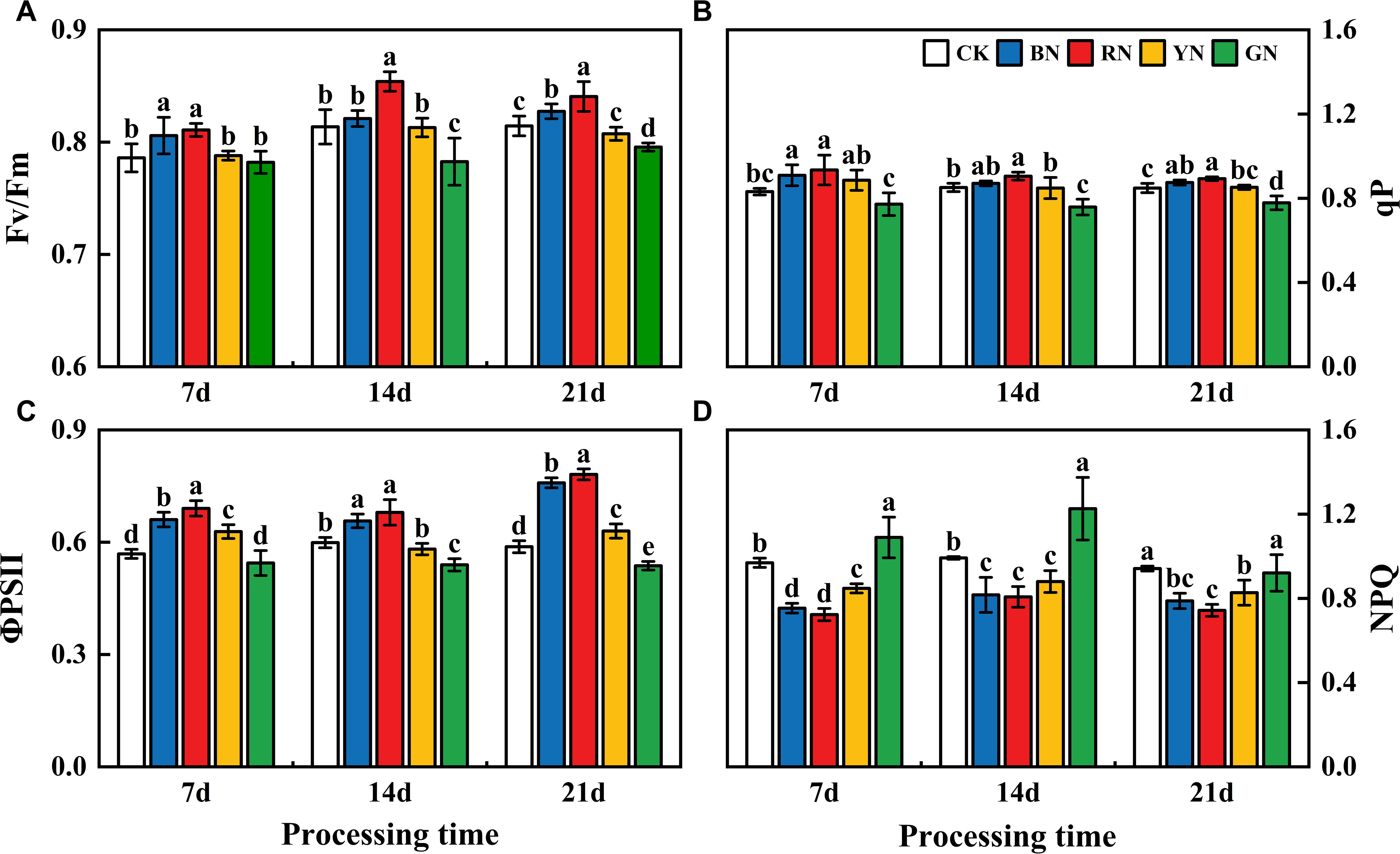 Photo-selective nets exerted significant influences on the chlorophyll fluorescence parameters of adzuki bean leaves. The chlorophyll fluorescence parameters (Fv/Fm, qP, ΦPSII) of each treatment displayed a descending order as follows: RN > BN >YN > CK> GN. In treatment 7 d - 21 d, compared with that in CK plants, Fv/Fm in RN and BN treatments increased by 3.14% - 5.04% and 0.91 - 2.52% relative to CK, whereas in GN decreased by 0.51 - 3.81% (Figure 6A). In treatment 7 d - 21 d, ΦPSII in RN and BN treatments increased by 6.31% - 32.85% and 9.65% - 29.01% relative to CK, while GN treatment caused a reduction of 4.31% - 9.92%. In treatment 7 d - 21 d, qP in RN and BN treatments increased by 5.20% - 12.63% and 2.26% - 9.33%, whereas GN treatment led to a 6.94% - 8.30% decrease (Figure 6B). Therefore, BN and RN significantly enhanced Fv/Fm and ΦPSII under partially closed reaction centers, whereas GN enhanced NPQ in adzuki bean plants.