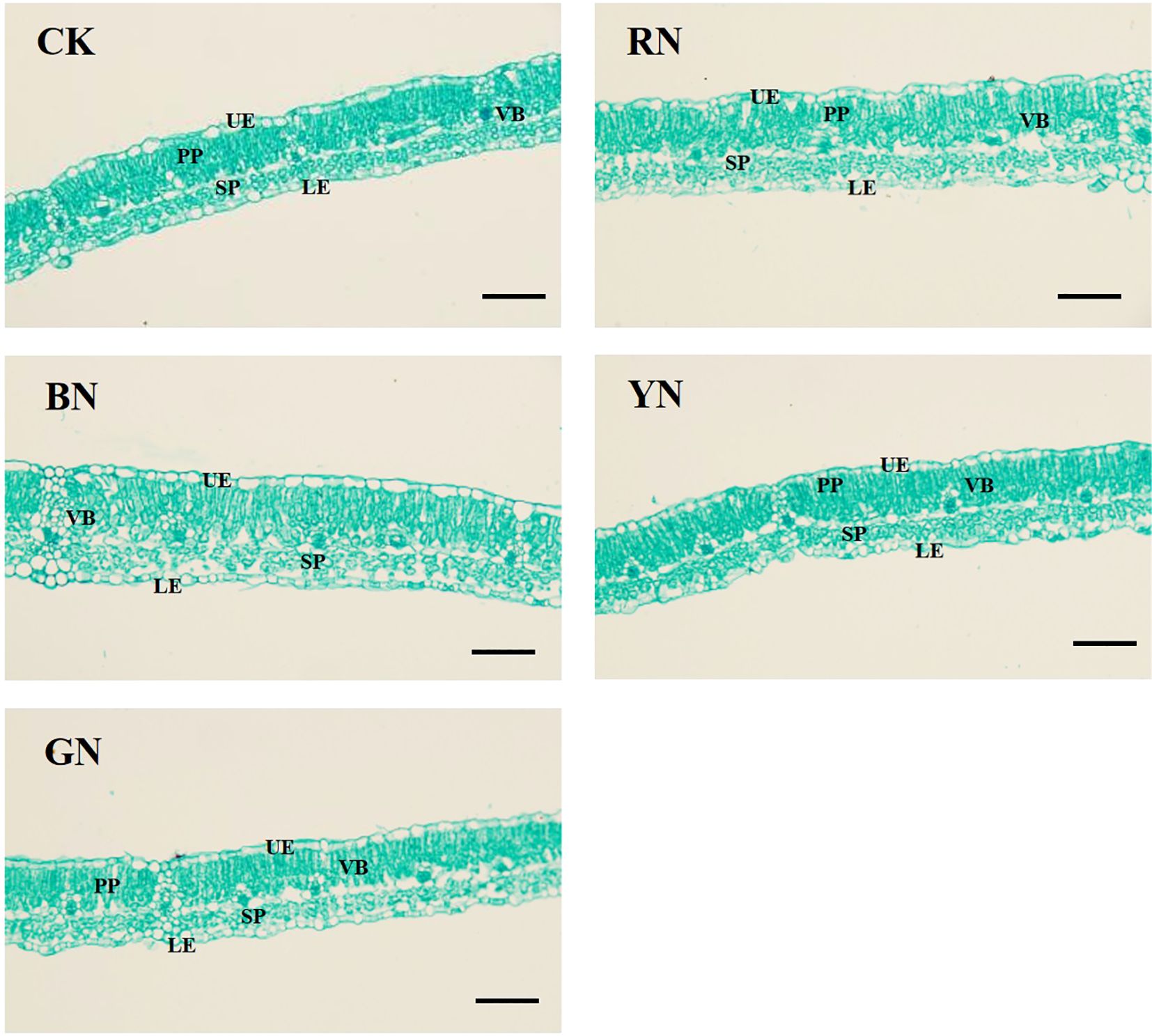 Figure 7. Leaf anatomical structure of adzuki bean under different photo-selective nets. UE, upper epidermis; PP, palisade parenchyma; SP, spongy parenchyma; LE, lower epidermis; VB, vascular bundle. Scale bars = 50 μm.