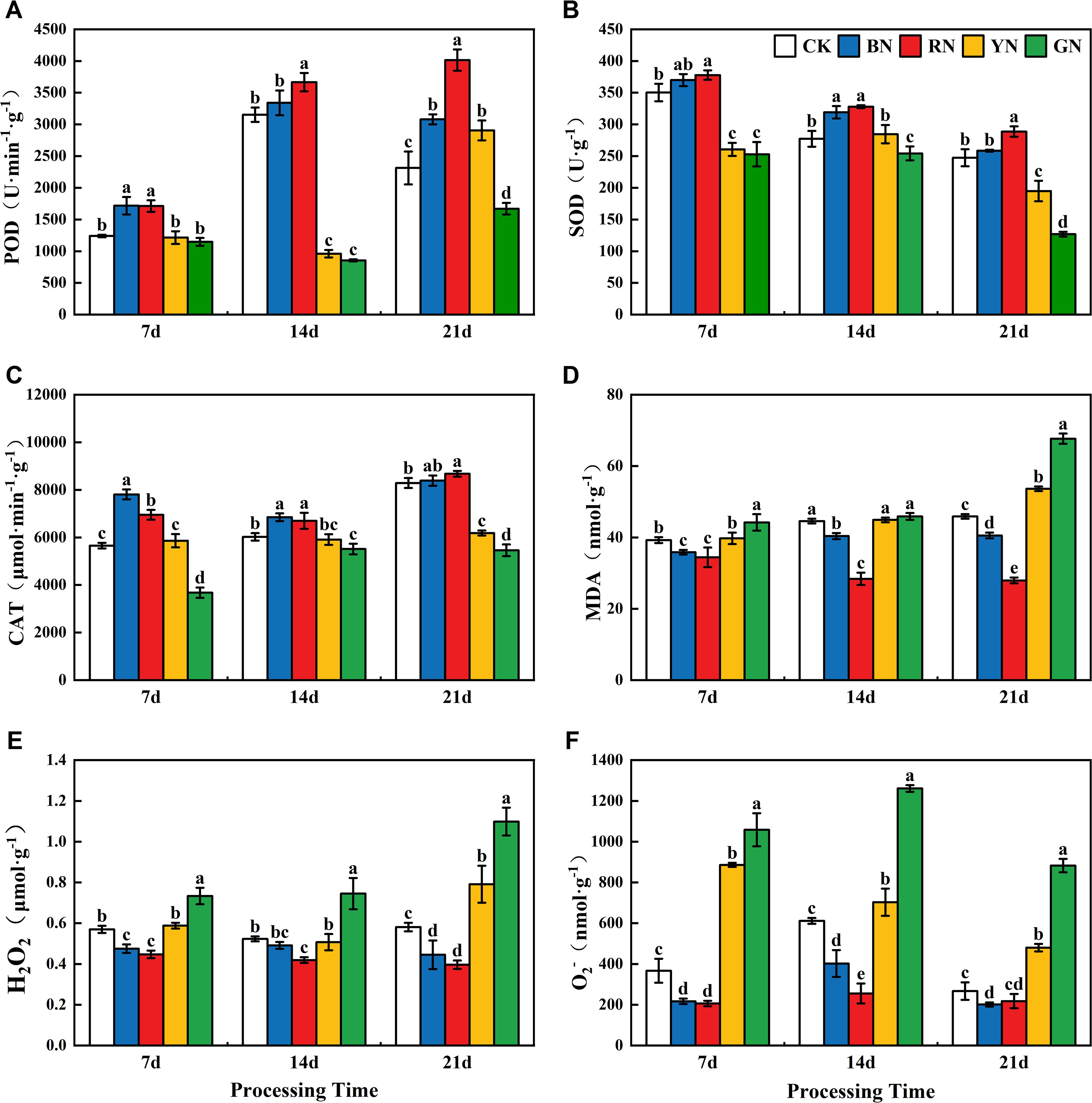 Figure 8. Effects of photo-selective nets on reactive oxygen species, malondialdehyde (MDA) content, and antioxidant enzyme activities in adzuki bean leaves across treatment durations. (A) POD activity, (B) SOD activity, (C) CAT activity, (D) MDA content, (E) H2O2, (F) O2- (superoxide anion).