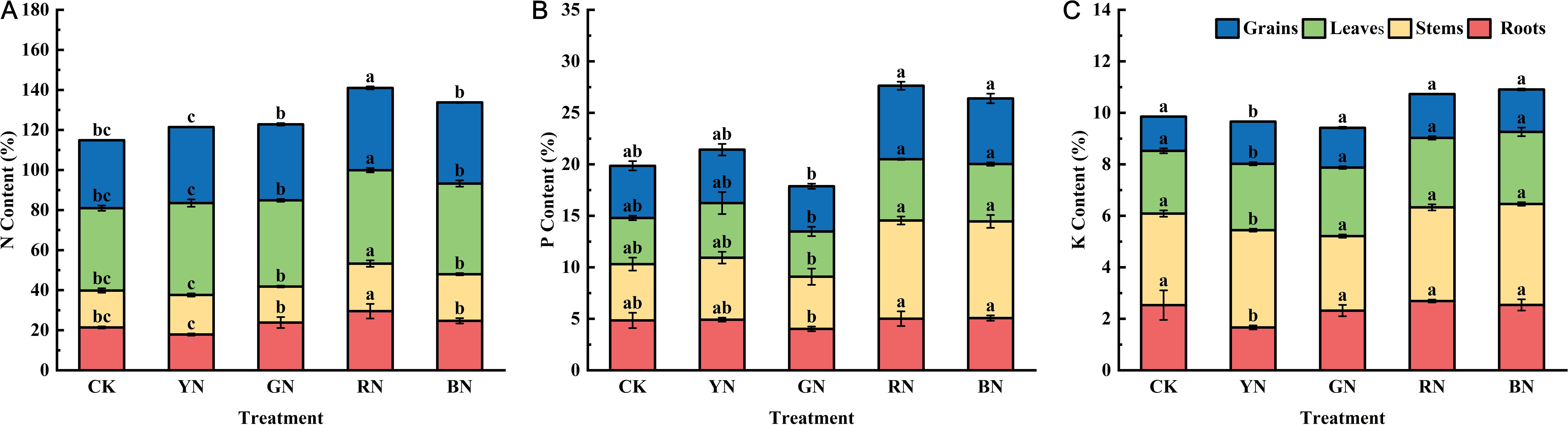 As primary macronutrients, nitrogen (N), phosphorus (P), and potassium (K) are fundamental to plant growth and development. During the harvest period, the concentrations of N, P and K in organs of adzuki beans (roots, stems, leaves and grains) were determined. Significant differences in plant nutrient balance were observed across photo-selective net treatments. Of which, RN treatment induced the highest nitrogen content in adzuki bean tissues, with leaves exhibiting peak accumulation (46.65% dry weight), followed by grain (41.09%), roots (29.52%), and stems (23.76%) (Figure 9). Under CK treatment, the nitrogen content in the leaves and grains of adzuki beans was at its lowest level, indicating that different photo-selective nets can enhanced the translocation of nitrogen to both the grains and leaves. Phosphorus concentration in roots, stems, leaves and grain of adzuki bean were significantly influenced by the photo-selective net treatments. Among them, RN and BN significantly increased phosphorus content in all tested tissues, whereas the total phosphorus content was lowest under GN treatment. As shown in Figure 9, potassium concentration of adzuki bean was also significantly influenced by the various photo-selective net treatments. Compared to control, all photo-selective net treatments significantly the increased potassium content in stems, leaves, and grains of adzuki beans.