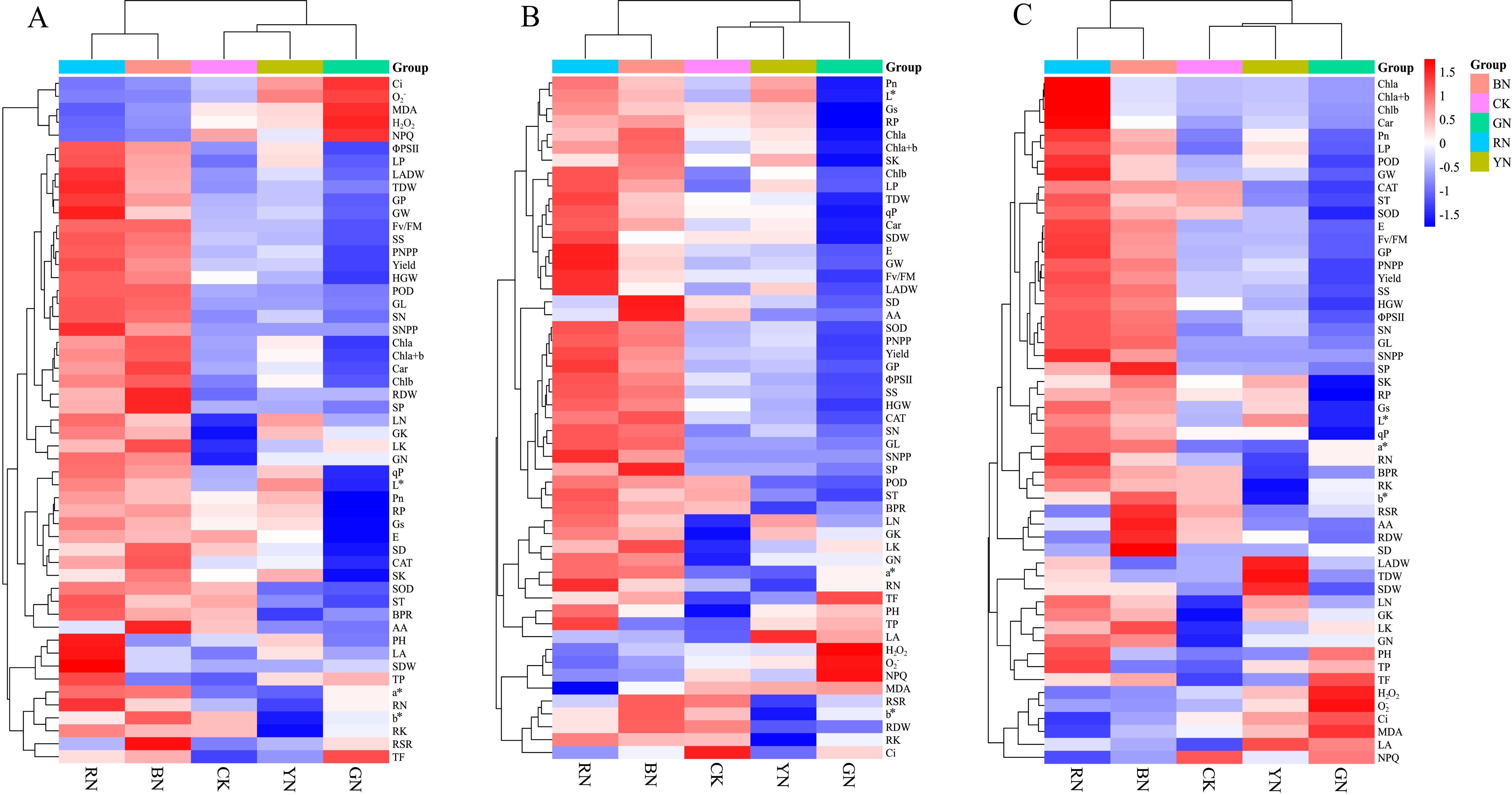 Figure 10. Cluster heat map analysis results of the phenotypic traits, photosynthetic indicators, antioxidant capacity, nutritional components, yield and quality of adzuki beans by photo-selective nets. (A) 7 days, (B) 14 days, (C) 21 days. Abbreviations of traits are listed in the abbreviations section.