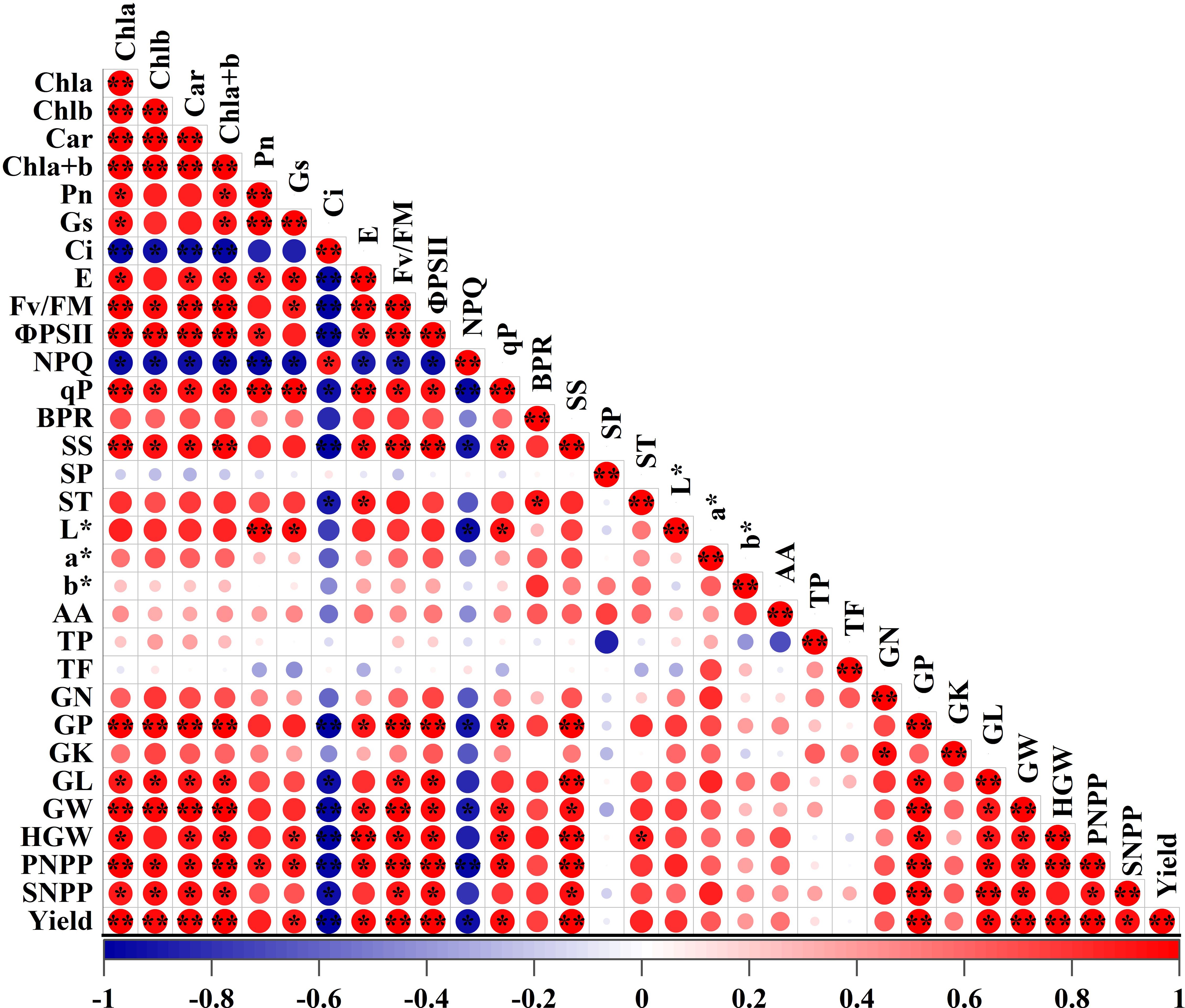 Figure 11. Correlation analysis between photosynthetic indices and yield quality traits in adzuki beans under photo-selective net treatments. Abbreviations of traits are listed in the abbreviations section * and * * were significant differences at P < 0.05 and P < 0.01, respectively.