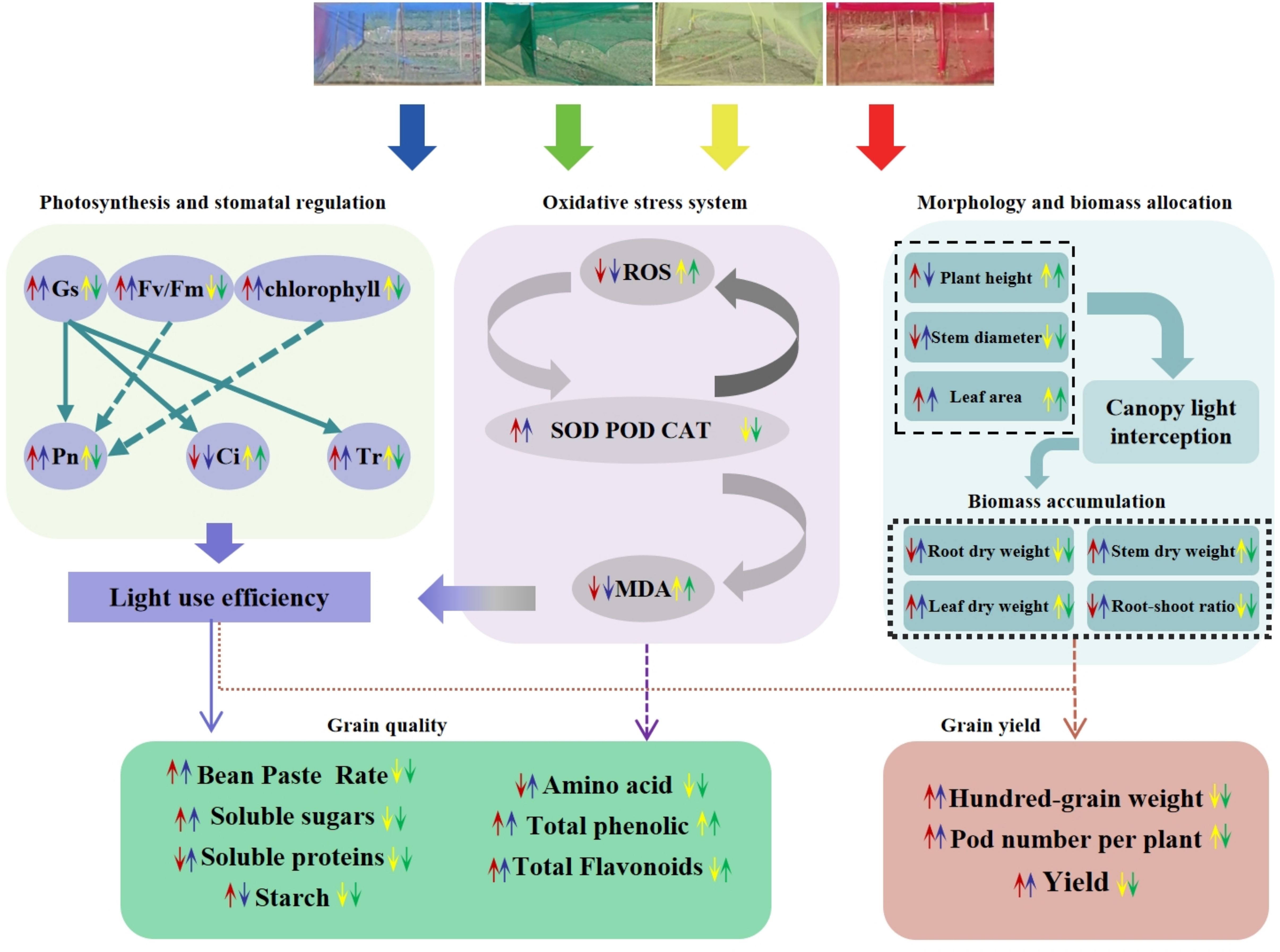 Figure 12. The mechanism of different photo-selective nets on the phenotypic traits, photosynthetic indicators, antioxidant capacity, yield and quality of adzuki beans.