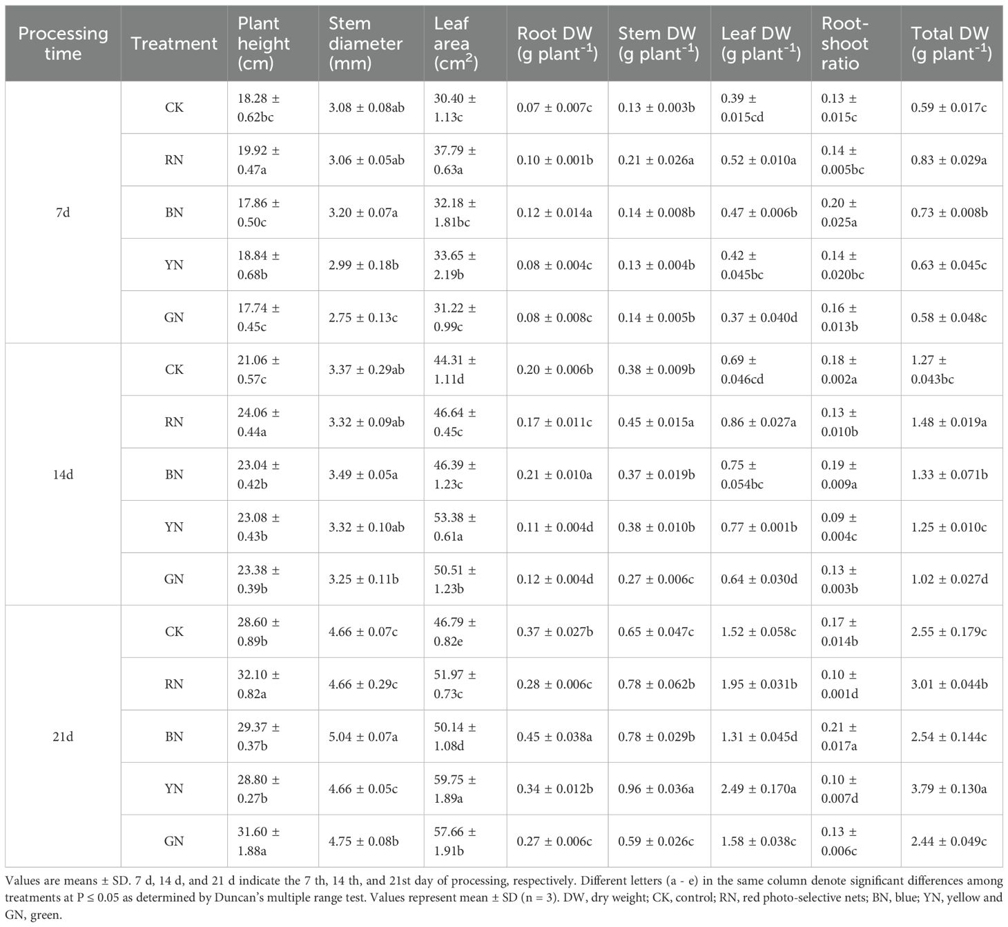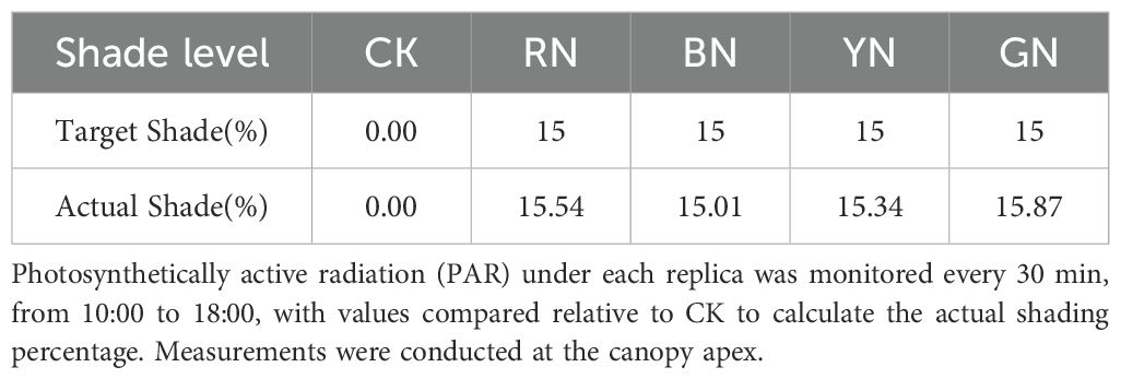 Table 1. Target shade percentages for control (CK), red, blue, yellow, and green photo-selective nets.