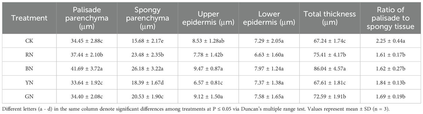 Anatomical structures of adzuki bean leaves were significantly influenced by different photo-selective nets (Figure 7; Table 3). Under BN and RN photo-selective nets, leaf sections exhibited palisade tissues with uniform cell size and tight arrangement. BN and RN photo-selective nets promoted larger palisade cells and additional layers of spongy mesophyll in leaf sections (Figures 7A). Furthermore, BN treatment increased the maximum values of total leaf thickness (TLT), palisade parenchyma (PP), spongy parenchyma (SP), and upper epidermis (UP), all showing to be statistically significant increases relative to CK and other photo-selective nets (Figure 7; Table 3). Specifically, leaf thickness under BN, RN, and GN treatments increased by 27.96%, 12.15%, and 7.96% relative to CK, respectively. The palisade and spongy tissues in RN and BN treatments increased by 8.68% and 49.74% (palisade), and 21.01% and 66.96% (spongy) relative to CK, respectively (Table 3). These morphological adaptations indicate that enhanced spatial organization of leaf tissues for more efficient light energy absorption potentially improves photosynthetic performance. However, no significant differences were observed in lower epidermal thickness or cellular arrangement across treatments.