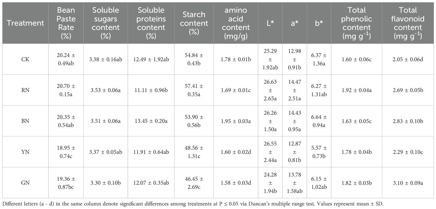 The appearance and nutritional qualities of adzuki bean kernels were evaluated under different photo-selective net treatments. The results showed that RN, BN and YN significantly increased the L* value of adzuki bean seed color, while RN and BN enhanced the a* value and BN significantly increased the value of b*. Overall, RN and BN treatments improved seed color and enhanced the appearance quality of adzuki beans. Quality evaluation showed no significant difference in bean paste rate among the treatments. However, significant differences were observed in starch, soluble protein, and soluble sugar contents under different photo-selective nets. The RN treatment increased soluble sugar and starch contents by 4.44% and 4.69%, respectively, compared to CK. The BN treatment promoted soluble protein and amino acid contents by 7.69% and 9.55%, respectively, relative to CK (Table 4). Total phenolics and flavonoids in adzuki bean seeds varied significantly under different photo-selective net treatments. Compared to control, all treatments significantly increased the contents of total phenolics and flavonoids. The highest total phenolics were observed in RN-treated seeds, followed by GN > YN > BN > CK, with increases of 20.00%, 13.75%, 11.25% and 1.88%, respectively. The total flavonoid content peaked in GN treated seeds, followed by BN>RN>YN>CK, showing to be increased by 51.21%, 38.05%, 31.22%, and 11.71%, respectively (Table 4). These findings indicate that photo-selective net treatments enhance the contents of total phenolics and flavonoids in adzuki bean grains.