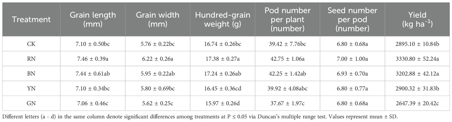 At physiological maturity, fifteen representative plants were randomly sampled per treatment to evaluate yield components, including pod number per plant, grain number per pod, and 100-grain weight. The actual plot yield was calculated based on the components.