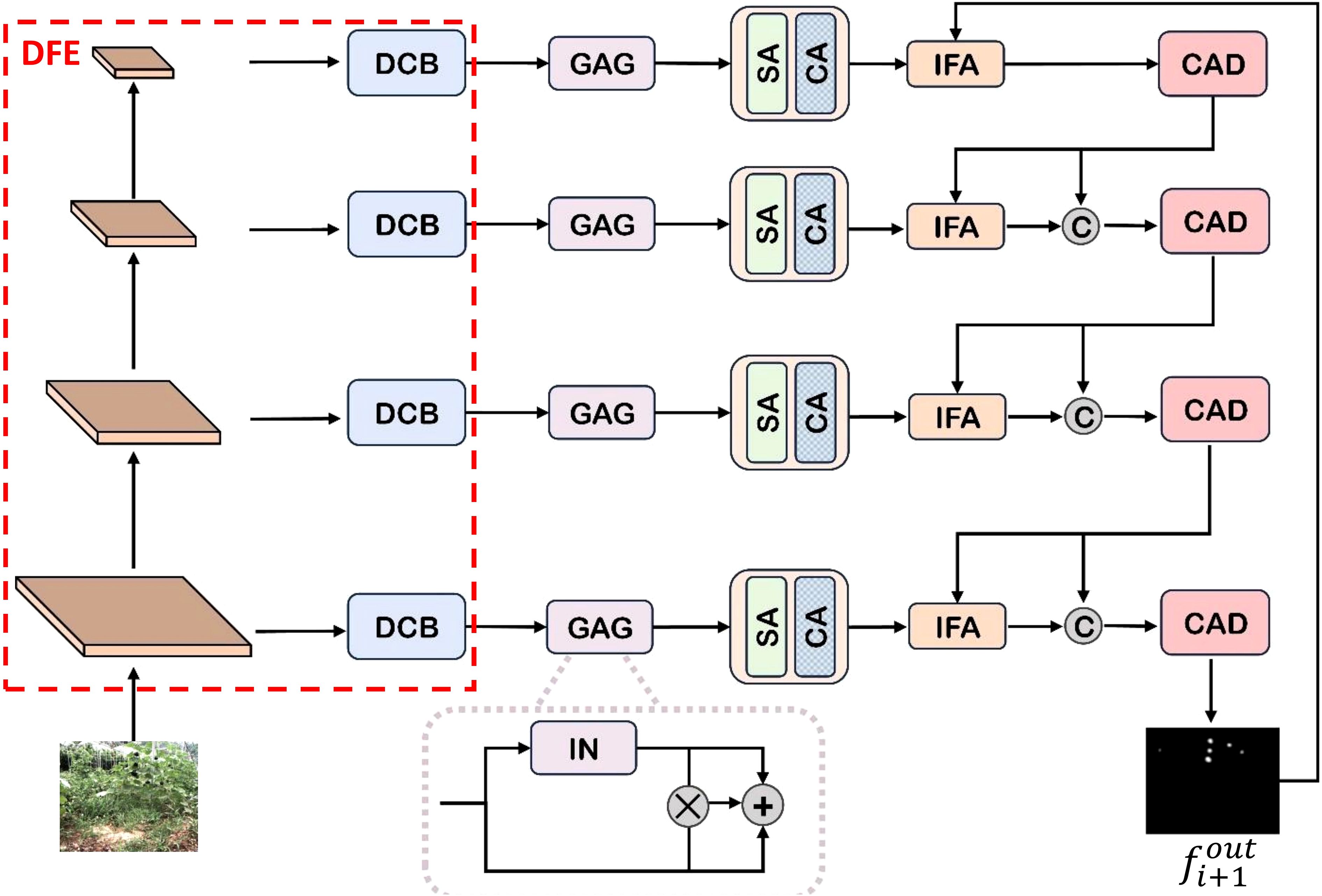 Figure 1. Architecture overview. DFE employs a visual pyramid to extract image features and generate multi-scale feature maps. It effectively retains fine-grained local information while fusing multi-layer semantic features of the object in a coherent manner. GAG leverages the attention mechanism to dynamically mitigate interference caused by low-visibility and enhances the response within the object region. CAD utilizes the cross-attention mechanism to capture long-range dependencies, thereby achieving robust multi-scale information fusion. IFA facilitates cross-layer interaction between high-level semantic features and low-level fine-grained features via an iterative optimization mechanism, with a focus on refining representations in the object area.
