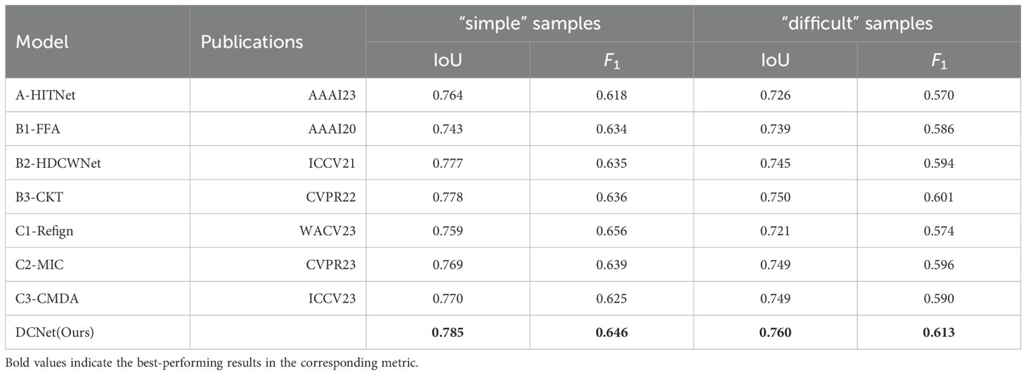 Following the experimental design, this section compares the performance of the basic detection method (A), the integrated denoising-based detection method (B), and the semantic segmentation method tailored for adverse weather conditions (C). To ensure fairness in the comparison of experimental results, all methods used for comparison followed the default settings for model training and evaluation. As shown in Table 1, using IoU and F1 score as evaluation metrics, the proposed method consistently outperforms in fruit detection tasks represented by both “simple” and “difficult” samples from the LVCD task, showing significant performance improvements in low-visibility fruit detection compared to other methods. We designs suitable encoding and decoding methods for low-visibility conditions, achieving a notable performance boost over the best object detection and combined detection methods. Additionally, feature optimization and iterative methods tailored for agricultural scenes provide more accurate segmentation results compared to low-visibility segmentation methods applied in other contexts. Furthermore, the proposed method exhibits minimal performance degradation from simple to challenging samples, demonstrating the robustness of the model under various conditions.