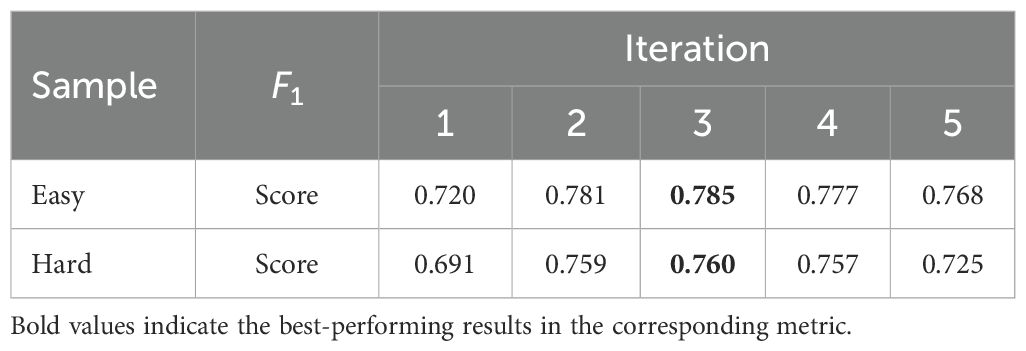 The method proposed in this paper is implemented using PyTorch, and all experiments are conducted on an RTX 3090 GPU, with the AdamW optimizer selected for parameter optimization. During the training phase, the total number of epochs is set to 150, with a batch size of 8. Experimental evidence indicates that higher resolution has a positive impact on detection performance, and the study uses a resolution of 704 × 704 as input during both training and testing phases. The learning rate is initialized to 0.0001 and is reduced to one-tenth of its value every 50 epochs. Regarding the optimal number of iterations, we devised a hyper-parameter tuning scheme to secure peak model performance and avoid degradation caused by under- or over-fitting. On both “easy” and “hard” subsets we varied the iteration count and compared the final detection results. As Table 2 shows, raising the iterations first boosts the F1, but once the number is too large the model begins to over-fit and the F1 drops. Consequently, the tuning experiment identifies 3 iterations as the best setting, and the iterative loss parameter set to 0.2.Wang et al. (2024).