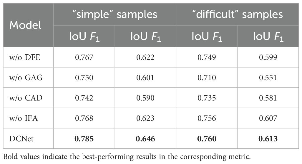 To investigate the effectiveness of the DCNet network, we conducted ablation studies on each of the introduced modules using the LVScene4K dataset. The detailed results are presented in Table 3.
