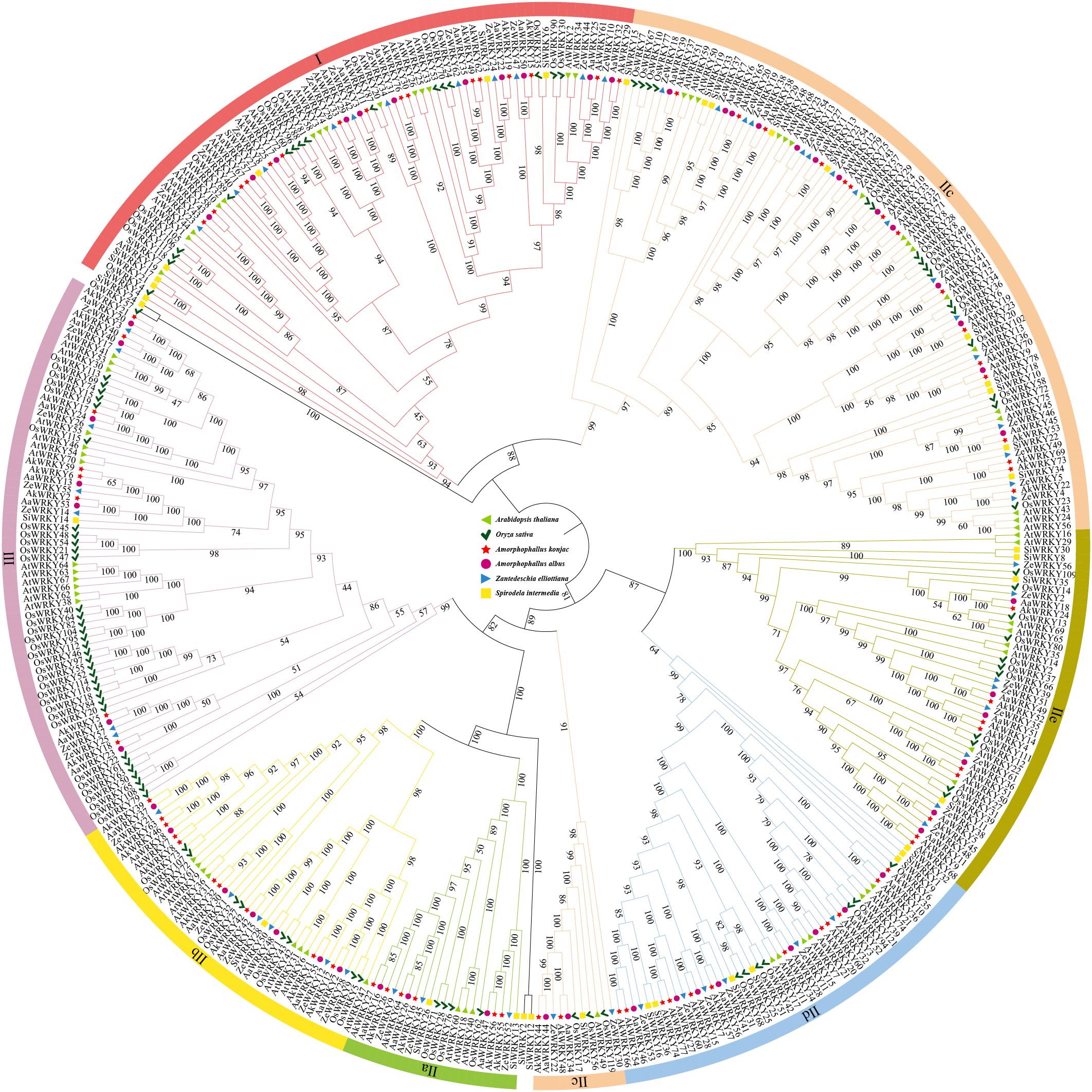 Figure 2. Phylogenetic relationship of WRKY genes in A. thaliana, O. sativa, A. konjac, A. albus, Z. elliottiana, and S. intermedia divided into 7 subfamilies, green triangles represent A. thaliana, dark green tick symbol represent O. sativa, magenta circles represent A. konjac, red five-pointed stars represent A. albus, blue triangles represent Z. elliottiana, and yellow squares represent S. intermedia.