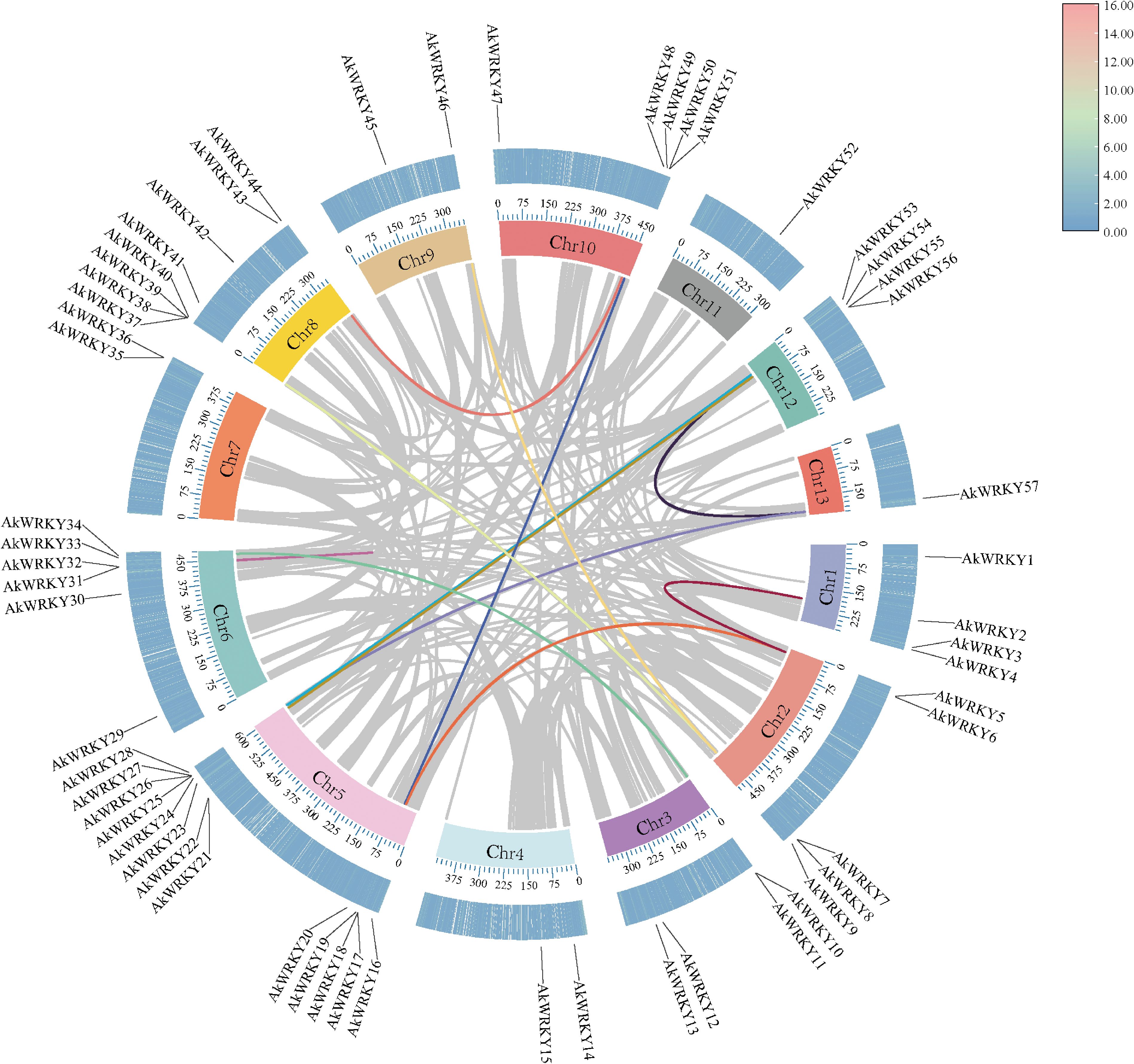 Figure 5. Collinearity relationships within WRKY genome across four species in the A. konjac, The colored lines in the middle represents the collinear relationship within the WRKY gene; The first circle represents the chromosome; The second circle represents the density of the AkWRKY gene (in heat map form).