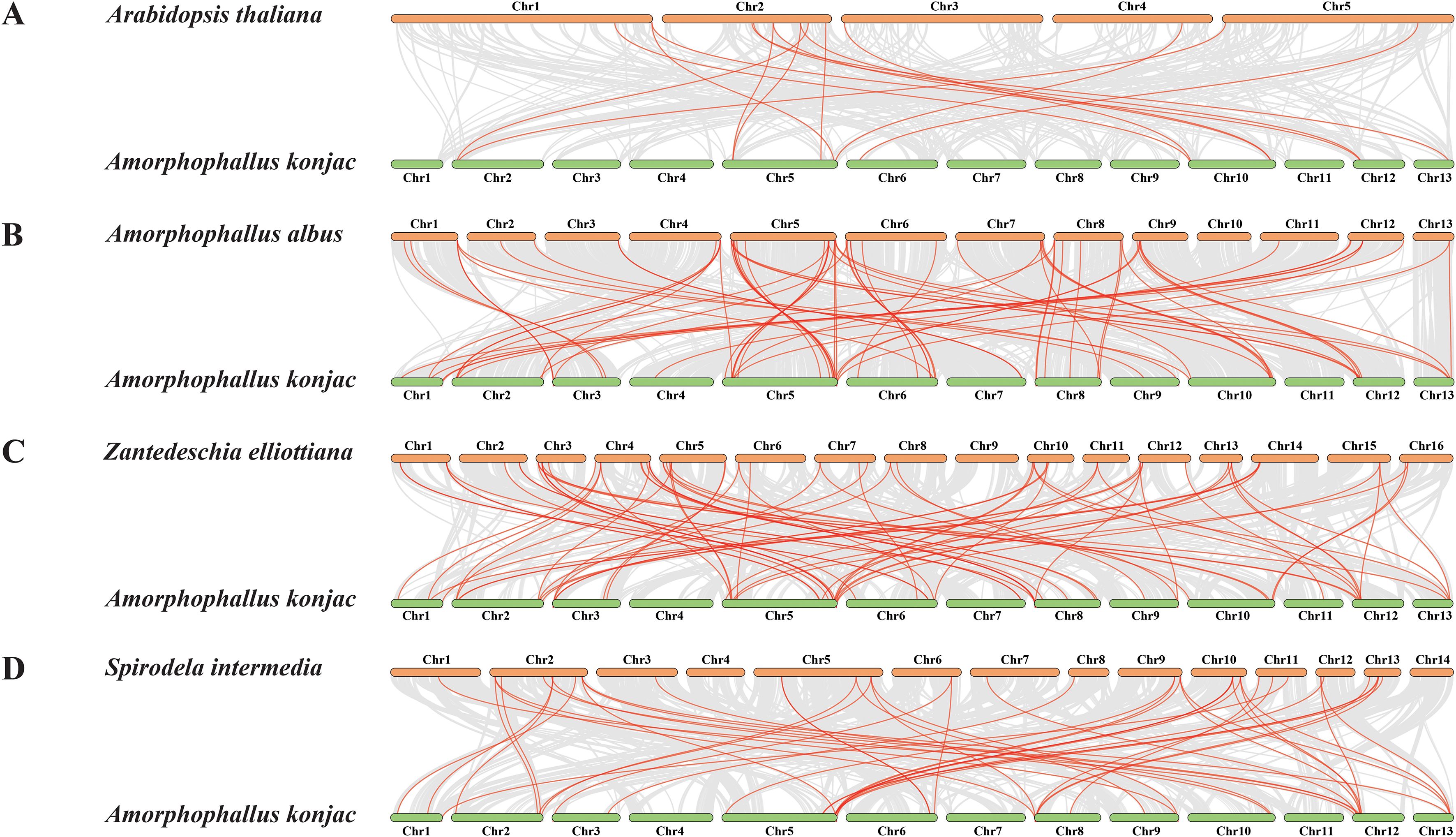 Figure 6. Inter-species collinearity analysis of AkWRKY gene family members with (A) A. thaliana, (B) A. albus, (C) Z. elliottiana, and (D) S. intermedia. The gray lines in the background represent collinear gene clusters, while the red lines indicate pairs of colinear WRKY genes with collinear relationships.