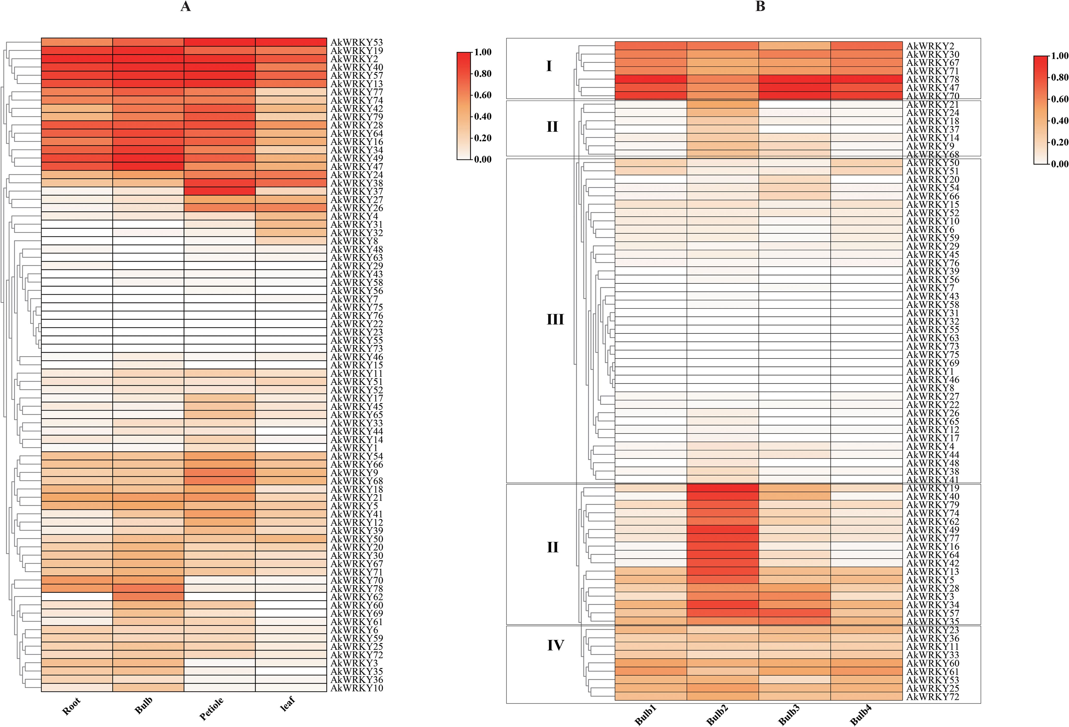 Figure 7. Heatmap of AkWRKY gene family expression profiles. (A) Expression of AkWRKY genes in different tissues, (B) Expression of AkWRKY genes across four corm developmental stages. Corm1 represents the dormancy stage, corms2 represents the “changing head” stage, corm3 represents the corms expansion stage, and corms represents the maturity stage, circle the different groupings with a black border.