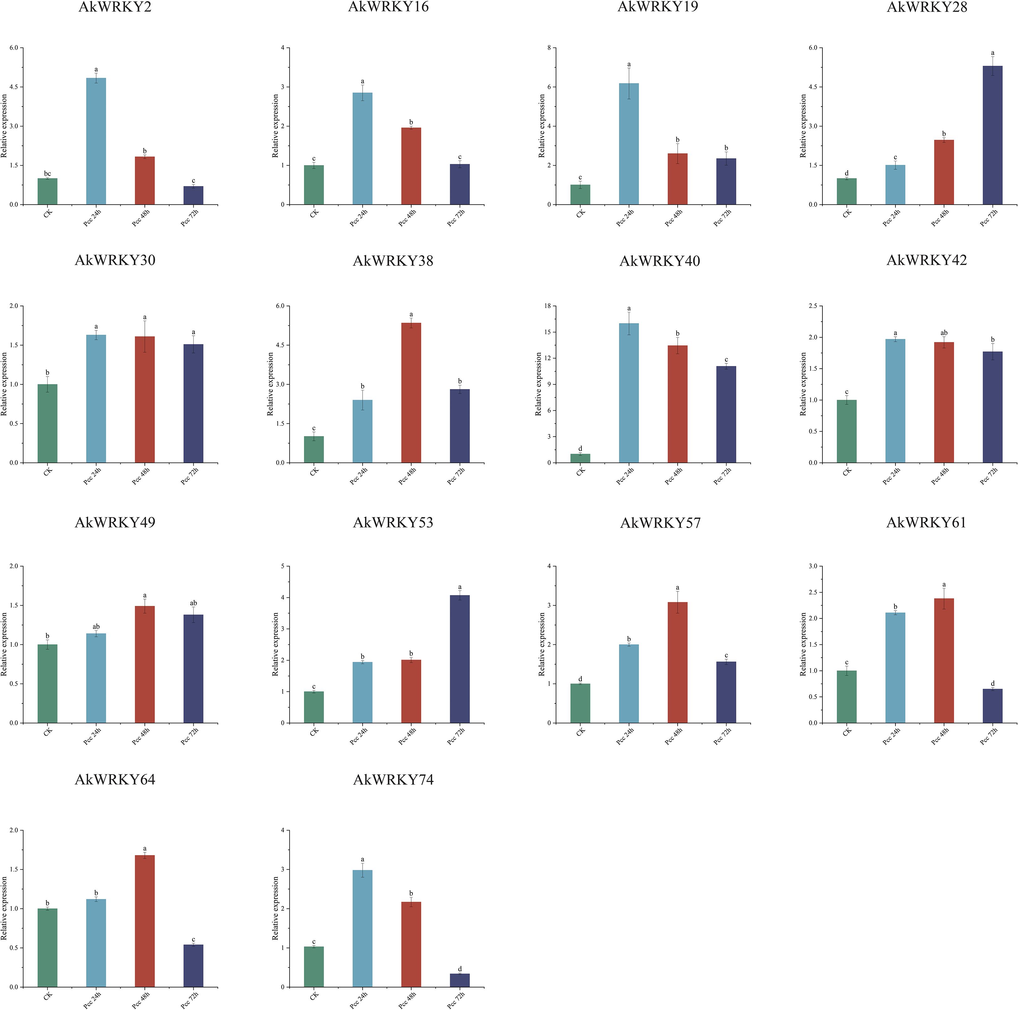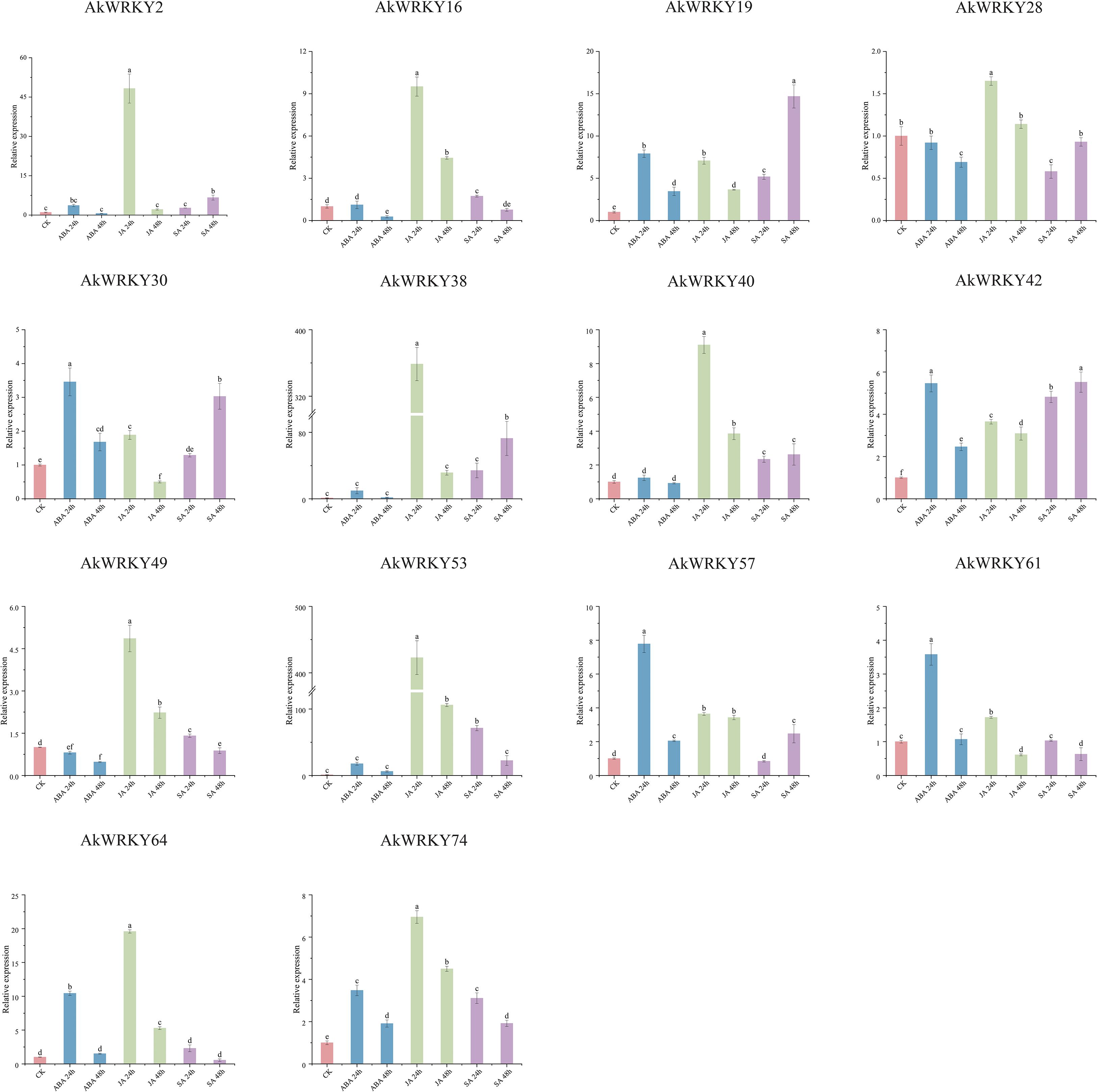 Because a large number of cis-acting elements related to plant growth and development, hormonal signaling, and stress responses are enriched upstream of the AkWRKY promoter, we analyzed their expression patterns using qRT-PCR. Specifically, we analyzed the expression of AkWRKYs under different hormone treatments, as well as biotic and abiotic stress conditions.
