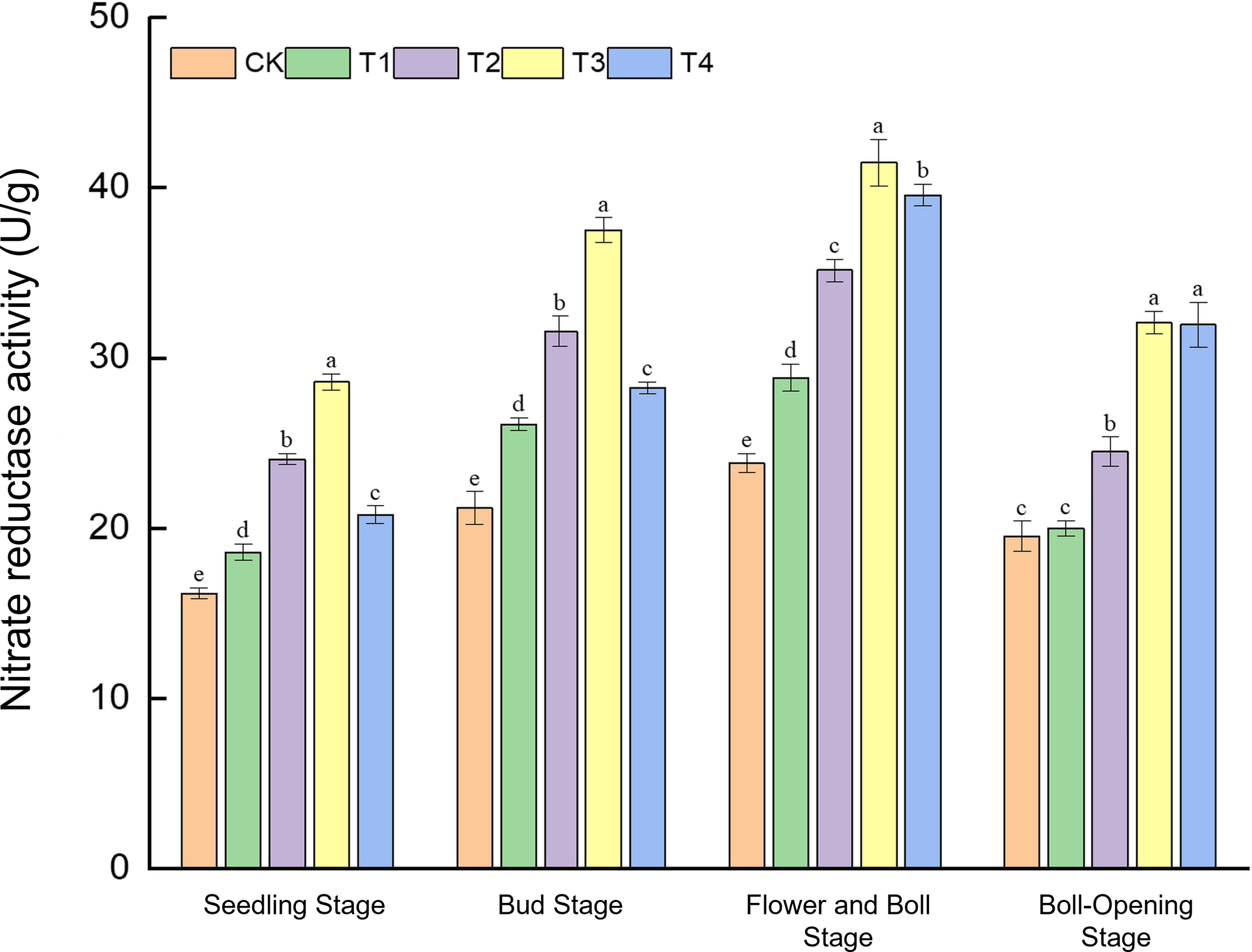 Effects of different treatments on nitrate reductase activity (U g−1) in cotton leaves. Different lowercase letters indicate significant differences in mean values between different treatments during the same growth stage, as determined by Duncan’s one-way ANOVA (p < 0.05).