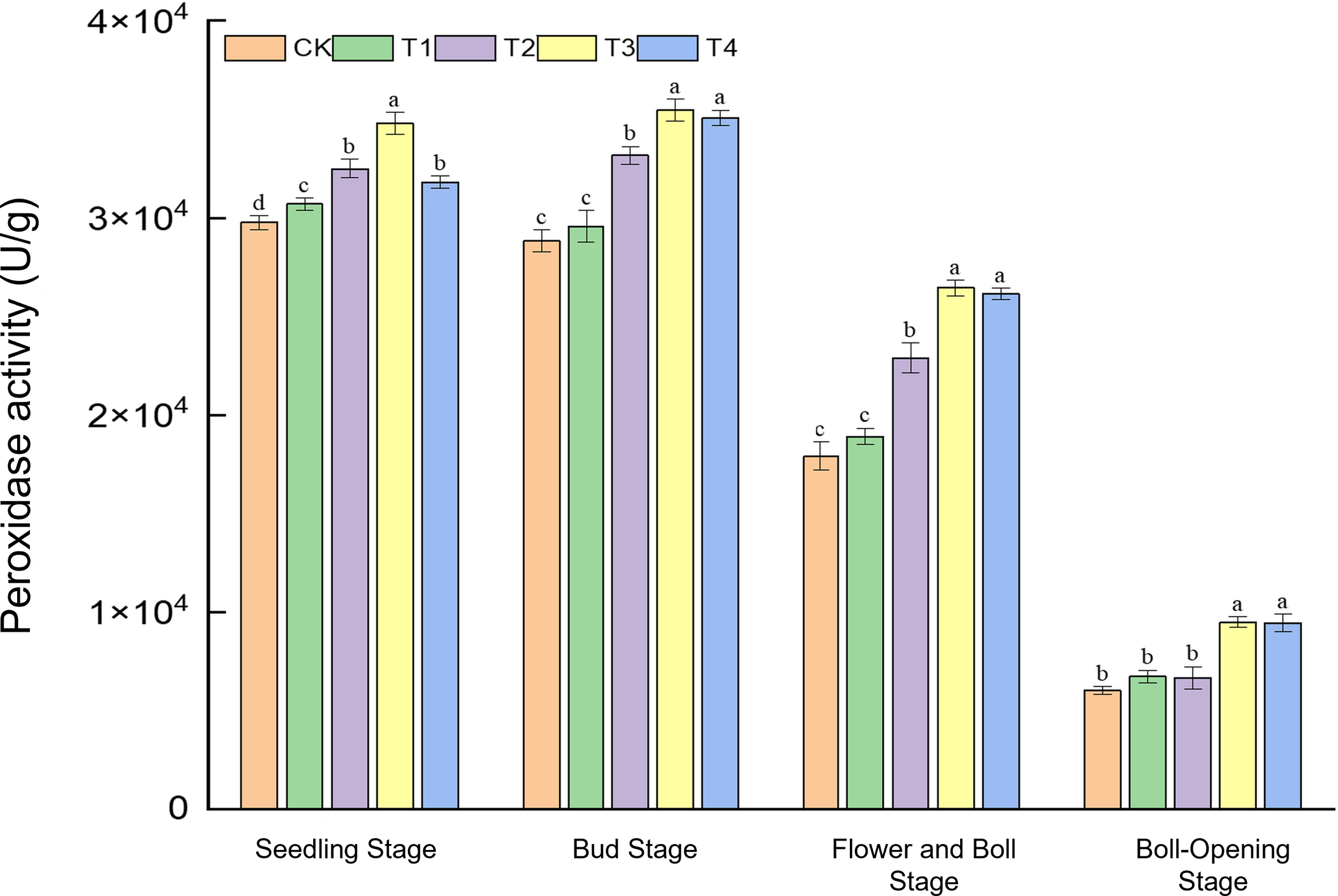 Effects of different treatments on peroxidase activity (U g−1) in cotton leaves. Different lowercase letters indicate significant differences in mean values between different treatments during the same growth stage, as determined by Duncan’s one-way ANOVA (p < 0.05).