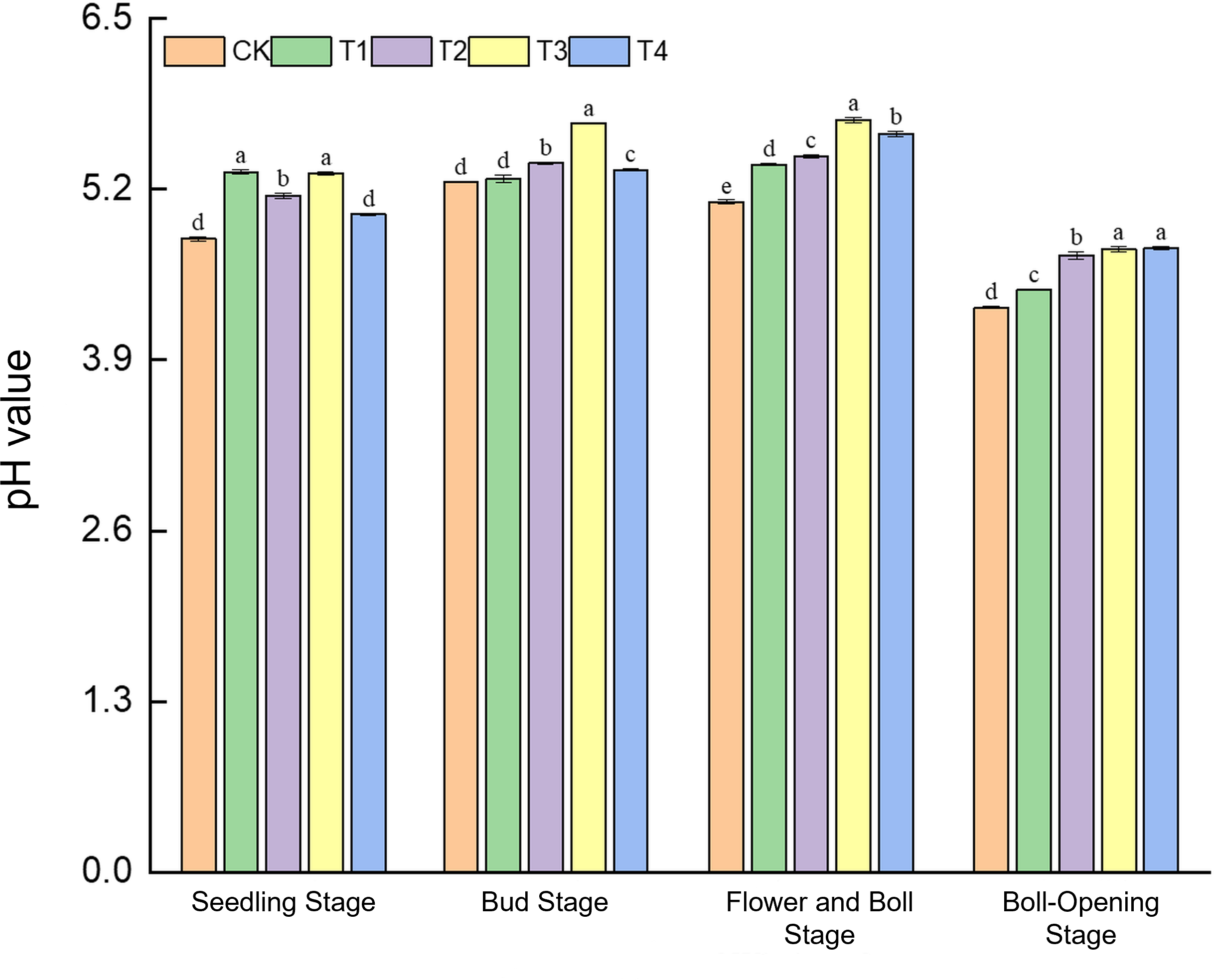 Effects of different treatments on soil pH in cotton fields. Different lowercase letters indicate significant differences in mean values between different treatments during the same growth stage, as determined by Duncan’s one-way ANOVA (p < 0.05).
