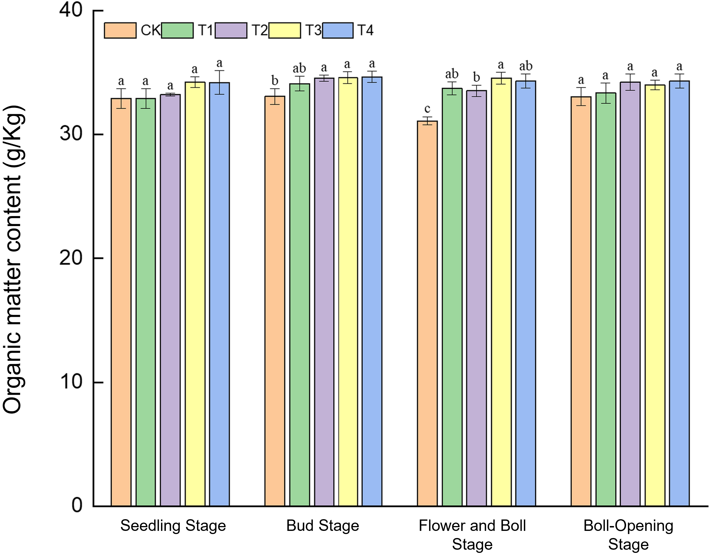 Effects of different treatments on soil organic-matter content in cotton fields. Different lowercase letters indicate significant differences in mean values between different treatments during the same growth stage, as determined by Duncan’s one-way ANOVA (p < 0.05).