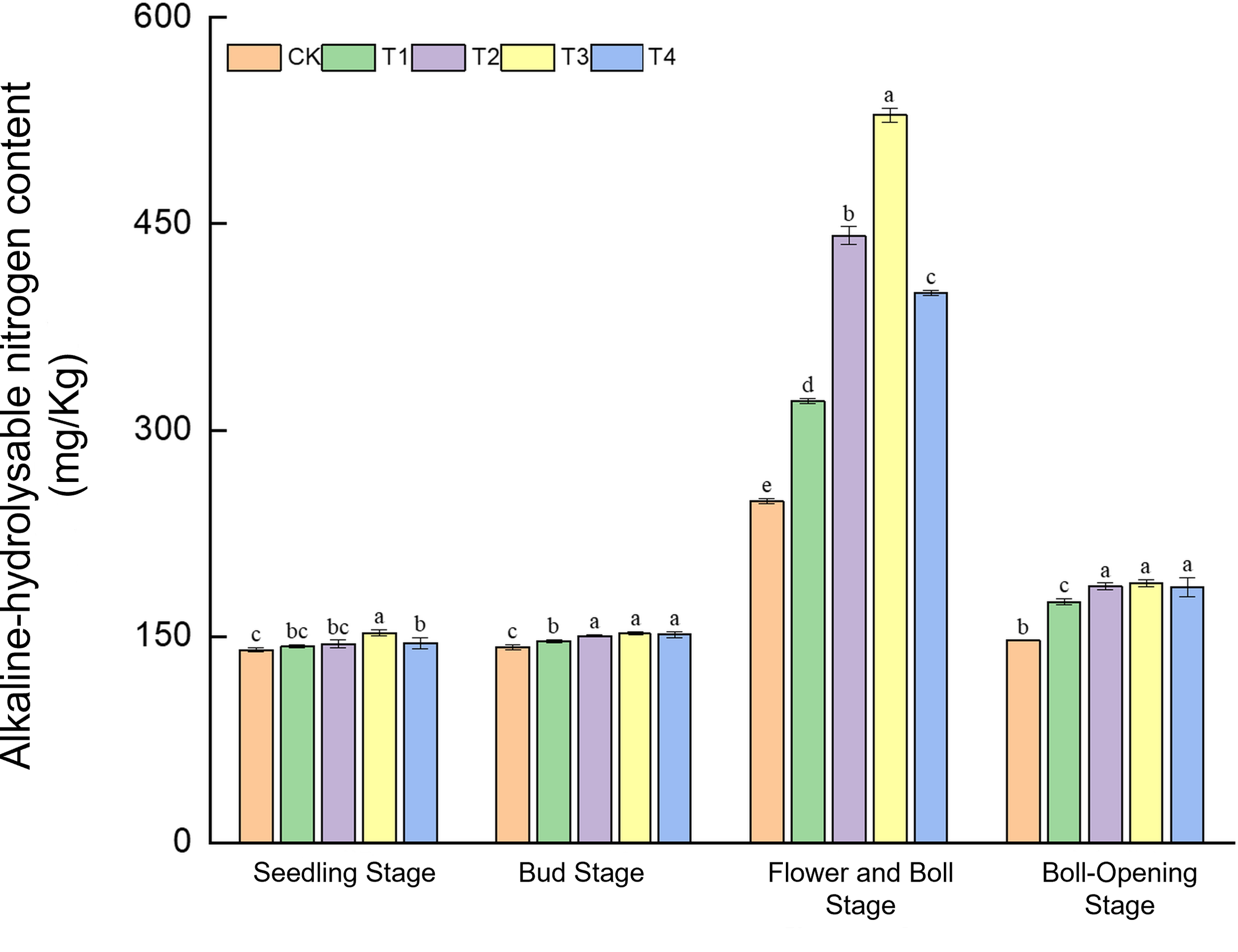Straw incorporation markedly enhanced the supply of alkaline-hydrolysable nitrogen, with effects varying dynamically across growth stages (Figure 6). In the seedling stage, T3 recorded the highest level (152.76 mg kg−1), 8.8% above CK. During the bud stage, T2–T4 (149.44–152.53 mg kg−1) exceeded CK (142.44 mg kg−1) by 4.9%–7.1%. A dramatic response occurred at the flower–boll stage: T3 peaked at 529.15 mg kg−1, surging 113.0% over CK (248.40 mg kg−1). At boll opening, T2–T4 (186.78–188.78 mg kg−1) surpassed CK (147.02 mg kg−1) by 27.0%–28.4%. These findings show that full-rate shredded return (T3) delivered an explosive release of readily available nitrogen (+113%) during the critical flower–boll stage, whereas surface mulching (T4) worked synergistically with shredded treatments (T2/T3) at the bud and boll-opening stages.