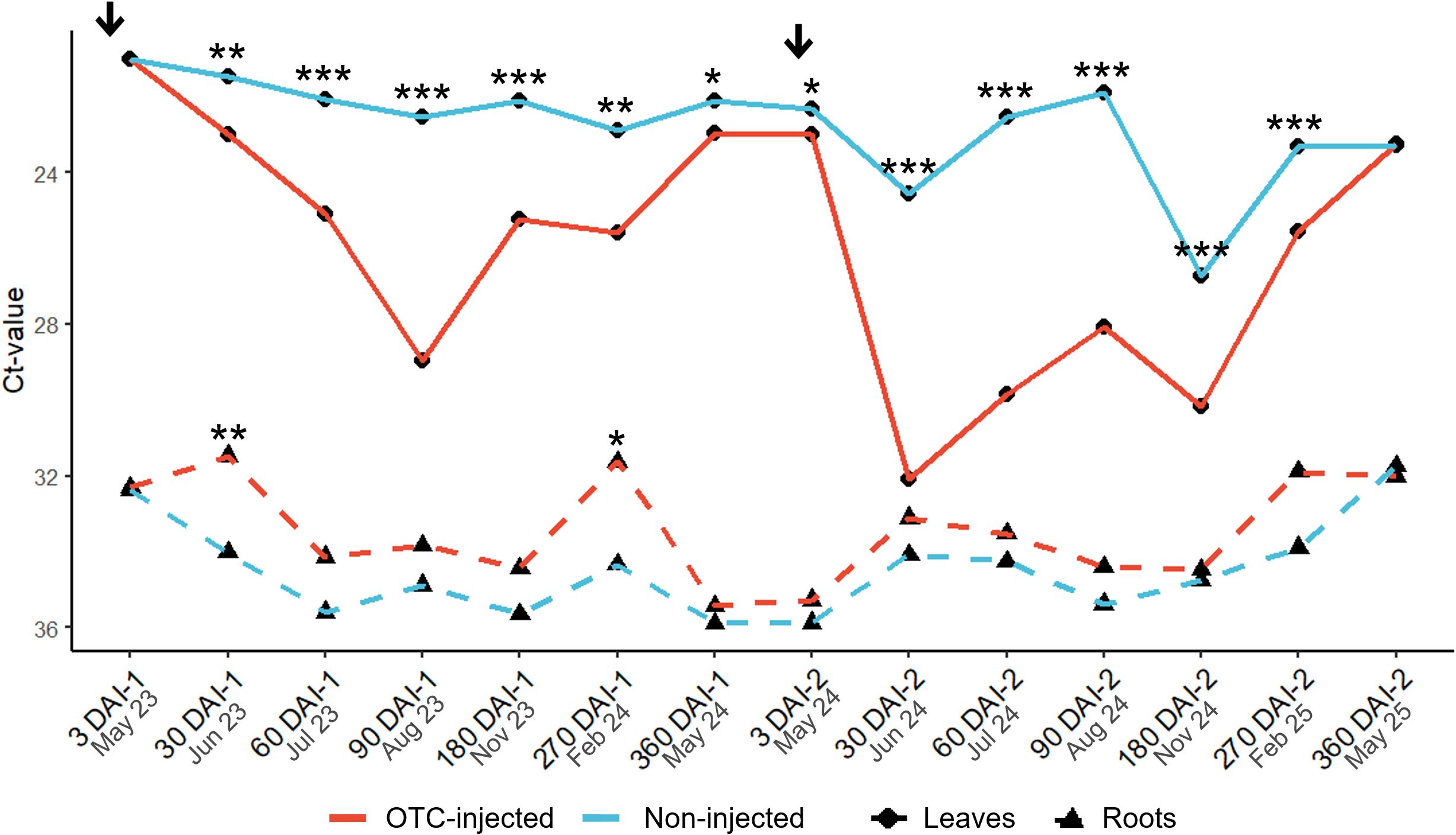 Figure 2. Graphical depiction of leaf and root Ct-values of OTC-injected and non-injected ‘Valencia’ trees. A low Ct-value indicates high bacterial titers and vice versa. Asterisks indicate statistically significant differences (*, P < 0.05; **, P < 0.01; ***, P <0.001) between OTC-injected and non-injected trees for each tissue. Arrows indicate the time of injections. For statistical details, see Tables 2 and 3. DAI-1 and DAI-2 are days after the first and second injection, respectively.