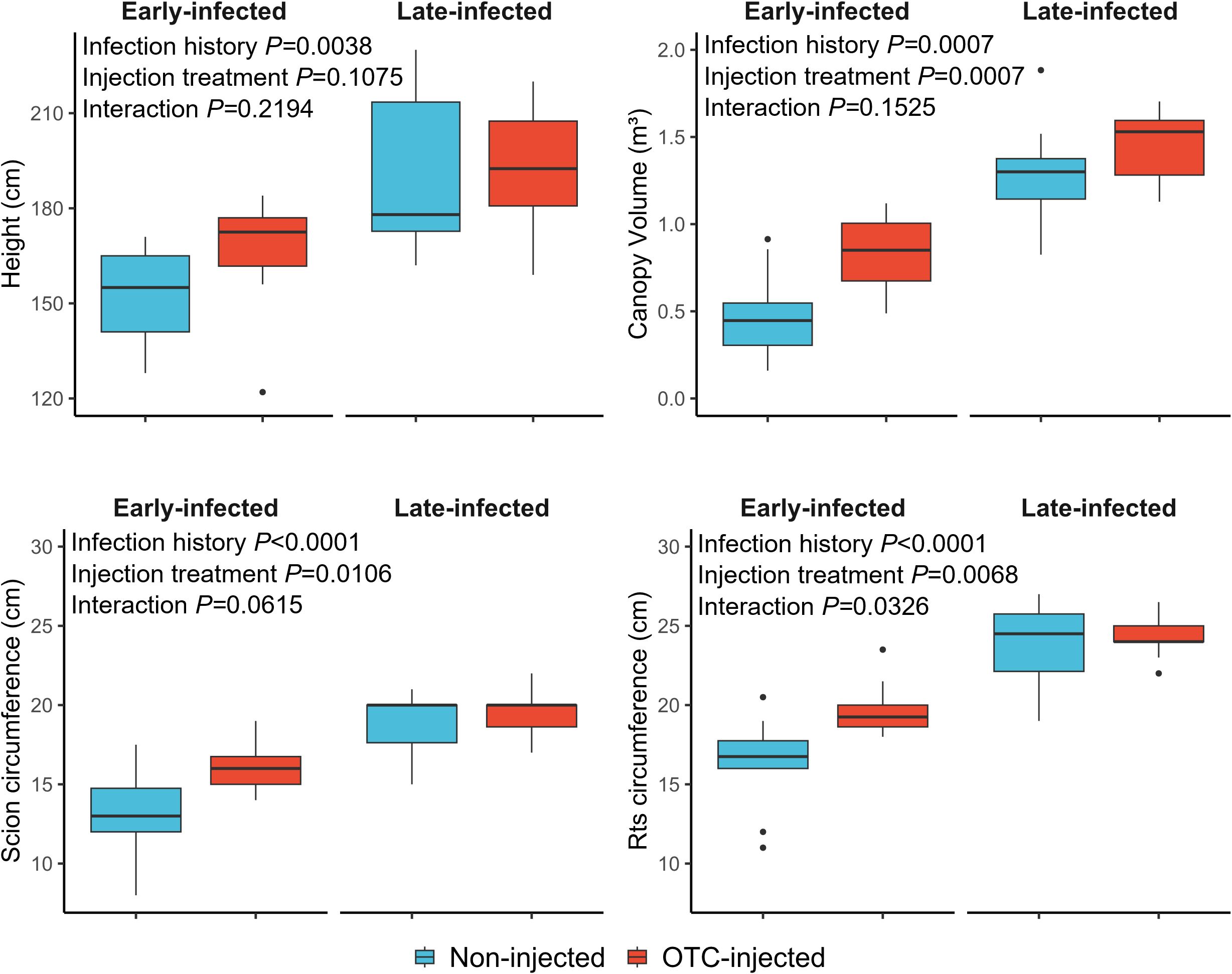 Figure 3. Graphical depiction of tree size responses of non-injected and OTC-injected ‘Valencia’ trees with early and late infection histories in November 2024. For statistical details, see Table 6.