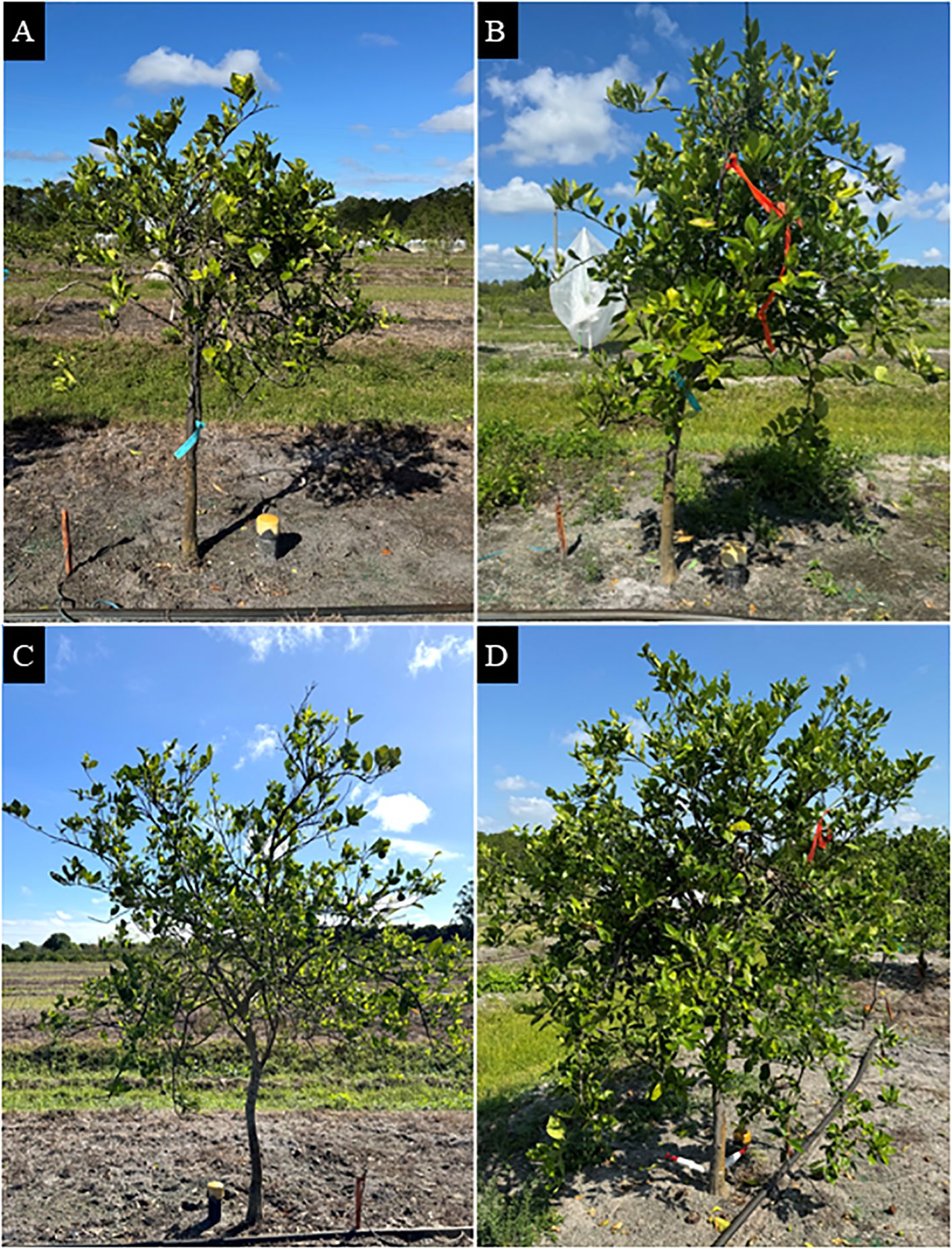 Figure 4. ‘Valencia’ sweet orange trees grown in a field site at the Southwest Florida Research and Education Center in Immokalee, FL. (A) Early-infected, non-injected tree; (B) early-infected, OTC-injected tree; (C) late-infected, non-injected tree; and (D) late-infected, OTC-injected tree. Photos were taken in March 2025.