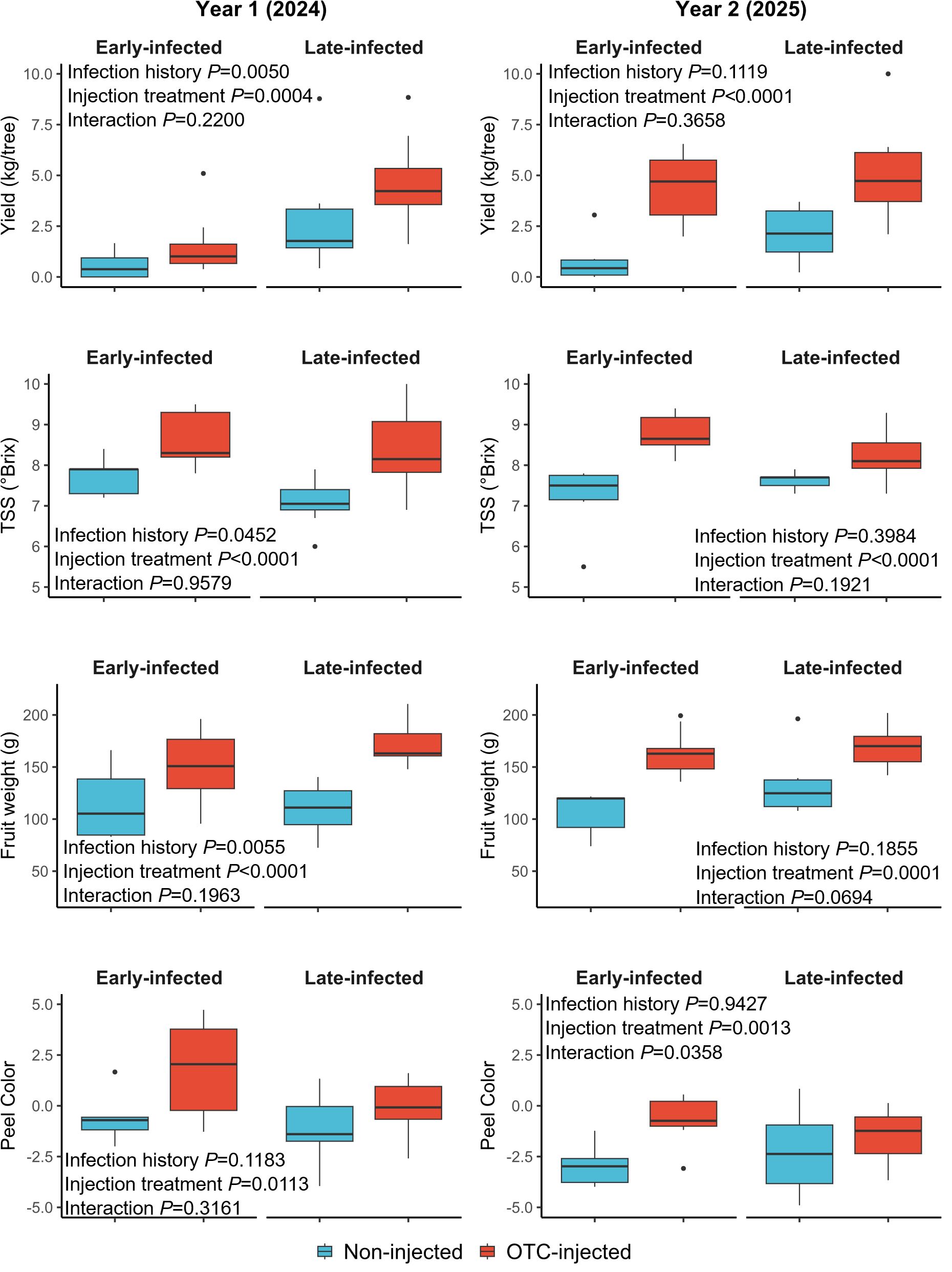 Figure 5. Graphical depiction of selected yield and fruit quality responses of OTC-injected and non-injected ‘Valencia’ trees with early and late infection histories in year 1 (2024) and year 2 (2025). Data are presented as boxplots with median, interquartile range, and outliers.