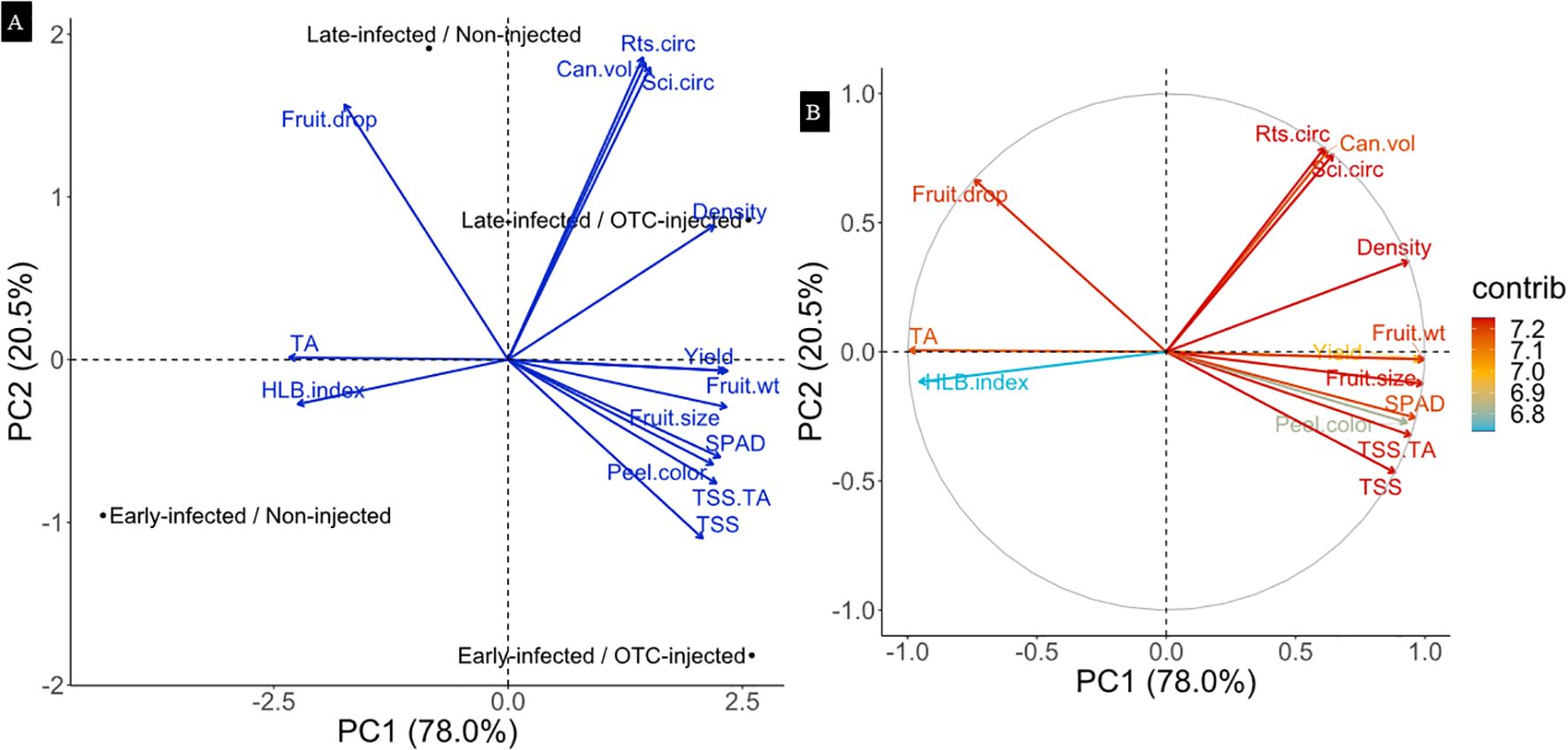 Principal component analysis (PCA) was conducted, excluding rootstock cultivar as a factor. The PCA plot shows that the first two principal components explained 98.5% of the total variance, with PC1 accounting for 78.0% and PC2 for 20.5% (Figure 6A). Along PC1, separation occurred mainly between OTC-injected and non-injected trees. This separation was mainly associated with yield, fruit weight, fruit size, peel color, and SPAD, which were positively correlated with injection, while HLB index and TA values were negatively correlated with injection. Along PC2, variation was primarily explained by infection history. Canopy volume and rootstock, and scion circumference contributed most to that separation and were positively correlated with late infection. Contribution analysis showed that all variables contributed similarly to PC1 and PC2, with values ranging from 6.8% to 7.2% (Figure 6B).