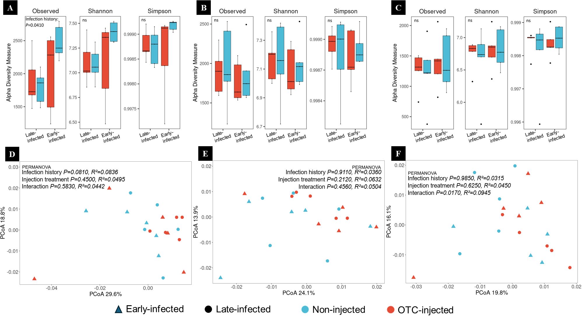 Figure 7. (A–C) Alpha diversity of root endorhizosphere bacterial communities of ‘Valencia’/US-942 trees with different infection histories and injection treatments at 30 (A), 90 (B), and 270 days (C) after the first injection 1 (DAI-1). Boxplots display observed richness, Shannon, and Simpson diversity indices of bacterial communities in OTC-injected (red) and non-injected (blue) trees with late and early infection histories. Statistical comparisons are annotated with “ns” for non-significant and “*” for significant differences (p < 0.05). (D–F) Beta diversity of root endorhizosphere bacterial communities at 30 (D), 90 (E), and 270 (F) DAI-1. Principal Coordinates Analysis (PCoA) plots are based on Bray-Curtis dissimilarities.
