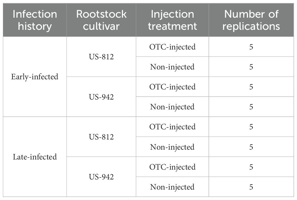 The experiment was a blocked 2 × 2 × 2 factorial design with five single-tree replications. The three factors were: 1) infection history, 2) rootstock cultivar, and 3) injection treatment. The first factor (infection history) had two levels with trees either classified as early-infected (exposed to psyllids and CLas since planting), or as late-infected (protected from psyllids and CLas for 18 months). The second factor (rootstock cultivar) had two levels with trees grafted on either US-812 or US-942. The third factor (injection treatment) also had two levels, with trees either injected with oxytetracycline (OTC-injected) or not (non-injected). The experimental treatments are summarized in Table 1.