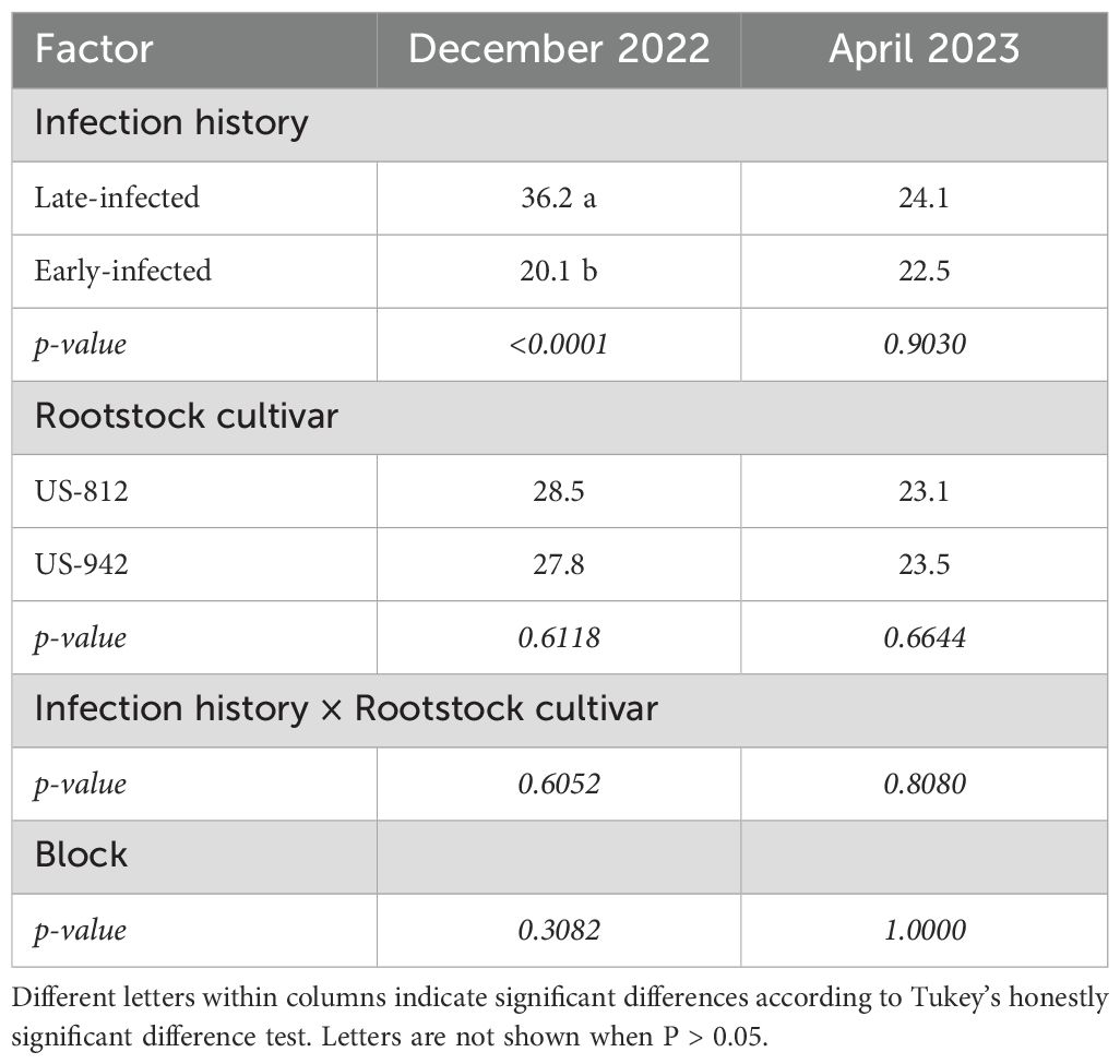There were no significant effects of infection history, rootstock cultivar, or injection treatment on the leaf macro- and micronutrient content in July 2024 (Supplementary Table S5). There were no significant block effects or interactions, except between infection history, rootstock cultivar, and injection for Fe, though there was no significant mean separation (data not shown).
