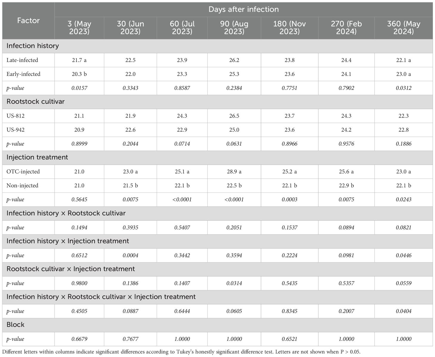 Supplementary Table 3 | Ct-values of fibrous roots of ‘Valencia’ trees on different rootstocks with different infection histories and injection treatments 3 to 360 days after the second OTC injection (DAI-2). Different letters within columns indicate significant differences according to Tukey’s honestly significant difference test. Letters are not shown when P > 0.05.