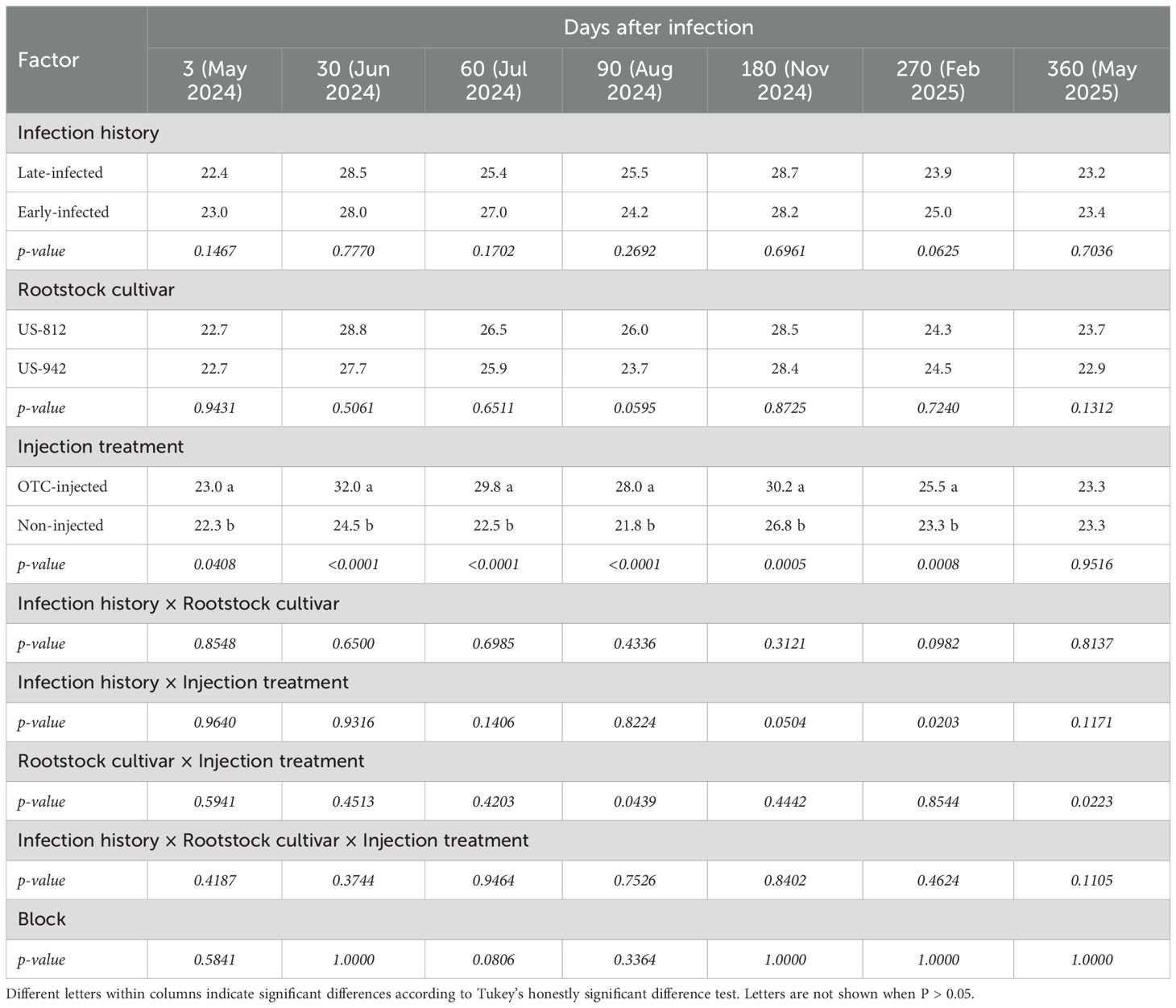 There was a significant effect of the infection history on the leaf Ct-value after the first OTC-injection (Table 3; Figure 2). At 3 DAI-1, late-infected trees had a significantly higher leaf Ct-value (21.7) and, therefore, lower leaf bacterial titers than early-infected trees (20.3). There were no significant differences between late- and early-infected trees at any other time except 360 DAI-1, although the mean separation was not significant. No significant differences in Ct-value were observed at any time between the two rootstock cultivars, but there was a significant effect of injection treatment. OTC-injected trees had higher leaf Ct-values (23.0-28.9) and therefore, lower leaf CLas titers than non-injected trees (21.5-22.9) from 30 DAI-1 to 360 DAI-1, with the largest differences found at 90 DAI-1 (Figure 2). A significant interaction between infection history and injection treatment was observed at 30 DAI, when early-infected, OTC-injected trees exhibited a higher leaf Ct-value (23.8) than early-infected, non-injected trees (20.2), and at 360 DAI, when early-infected, OTC-injected trees exhibited higher Ct-value (23.8) than early-infected, non-injected trees (20.2) (Supplementary Table S1). The three-way interaction between infection history, rootstock cultivar, and injection treatment was significant at 360 DAI, but there was no significant mean separation (Supplementary Table S1). There were no significant block effects.