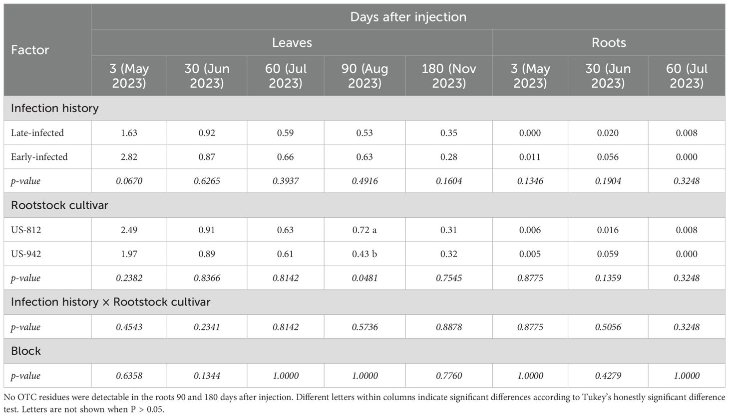 Leaf OTC residues were highest at 3 DAI-1 (1.63-2.82 μg/g) and lowest at 180 DAI-1 (0.28-0.35 μg/g) (Table 5). Infection history and rootstock cultivar did not significantly affect leaf OTC residues, except at 90 DAI, when trees on US-812 rootstock had higher leaf OTC residues (0.72 μg/g) than those on US-942 (0.43 μg/g). There was no block effect, nor were there any significant interactions. Fibrous root residues were below 0.06 μg/g, and there was no significant effect of any of the factors or their interaction (Table 5). No residues were detected between 90 and 180 DAI-1 (data not shown).