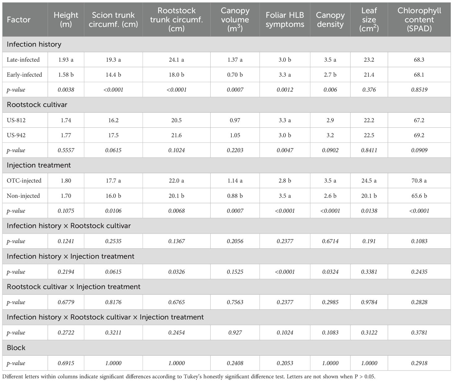 A linear mixed model in R programming (Version 4.3, R Core Team, 2024) was used with infection history, rootstock cultivar, and injection treatment as fixed factors and block as a random factor. The Shapiro-Wilk tests and Q-Q plots were employed to assess assumptions of normality and homogeneity of distribution of the data. When assumptions were not met, data were log-transformed. CLas titers (Ct-values) were analyzed for each sampling time and each tissue (leaves and roots). Where effects were significant (P < 0.05), a post-hoc comparison of means was conducted using Tukey’s honestly significant test (emmeans). Visual ratings of canopy health were analyzed non-parametrically using aligned ranks transformation ANOVA (ART). Principal component analysis (PCA) was performed on standardized data to reduce the influence of different measurement scales among variables (Sneath and Sokal, 1973). Contribution analysis was included to assess the relative importance of individual variables. Cluster analyses were conducted using the NbClust package in R version 4.3 (Charrad et al., 2014), while PCA was performed using the FactoMineR package (Lê et al., 2008). Variables included in the PCA were selected based on their statistical significance. Only data from year 2 (after the second OTC injection) were included in the PCA.