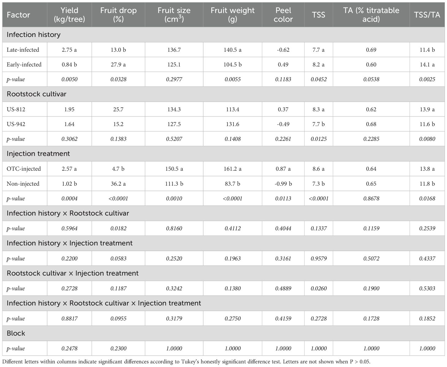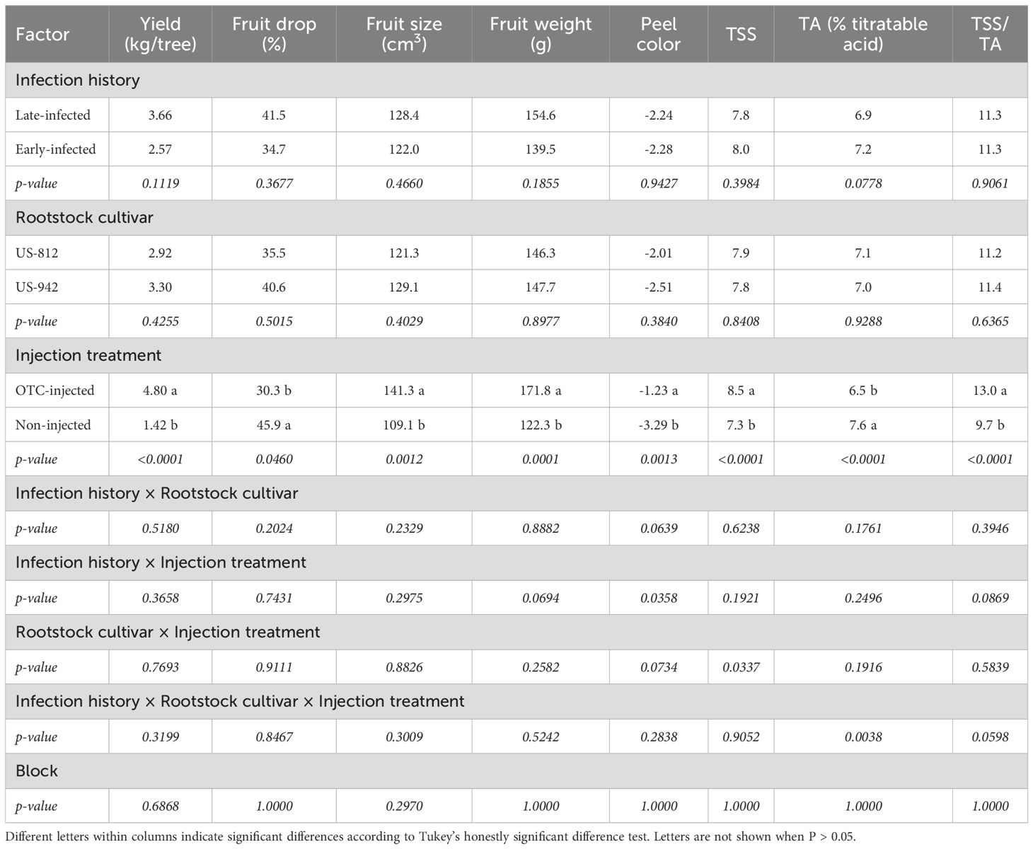 Trees exhibiting more severe HLB symptoms generally experience significantly more fruit drop than trees with less severe symptoms (Tang et al., 2019 and 2020). In our study, pre-harvest fruit drop was reduced in OTC-treated trees across both seasons, consistent with these findings. Beyond the effects of injection treatment, infection history also significantly influenced fruit drop, but only during the first year of injection, when late-infected trees exhibited lower drop rates than early-infected trees, indicating a stronger influence of injection treatment over time following IPC removal.