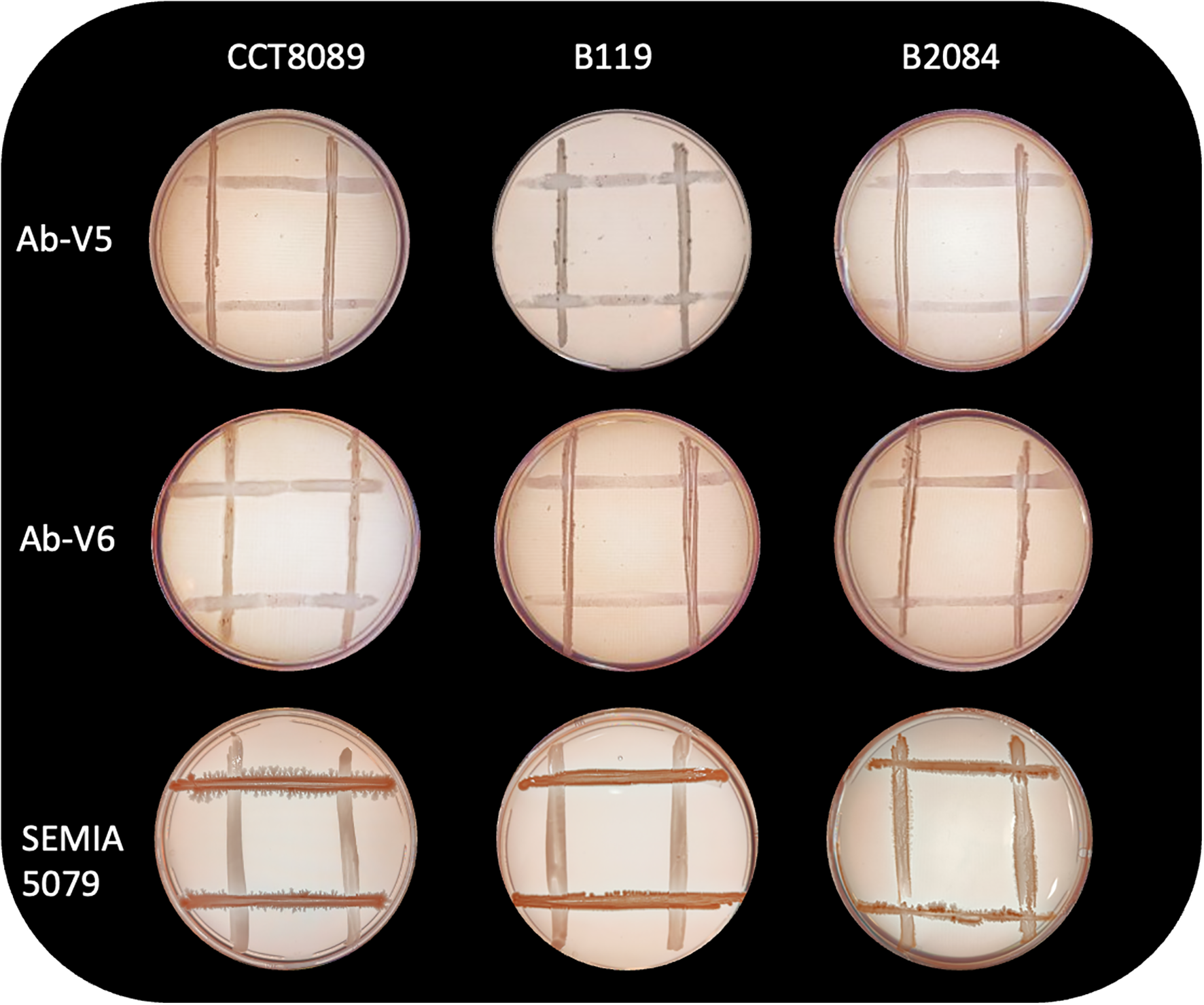 The in vitro analysis showed that all three Bacillus strains (CCT8089, B119, and B2084) demonstrated the ability to tolerate water stress, as well as produce exopolysaccharides (EPS) and biofilm (Table 1). Additionally, these strains were compatible with Azospirillum brasilense (Ab-V5 and Ab-V6) and Bradyrhizobium japonicum (SEMIA 5079) (Figure 1). However, only strain CCT8089 exhibited antagonistic activity against the phytopathogenic fungi Sclerotinia sclerotiorum and Macrophomina phaseolina (Figure 2).