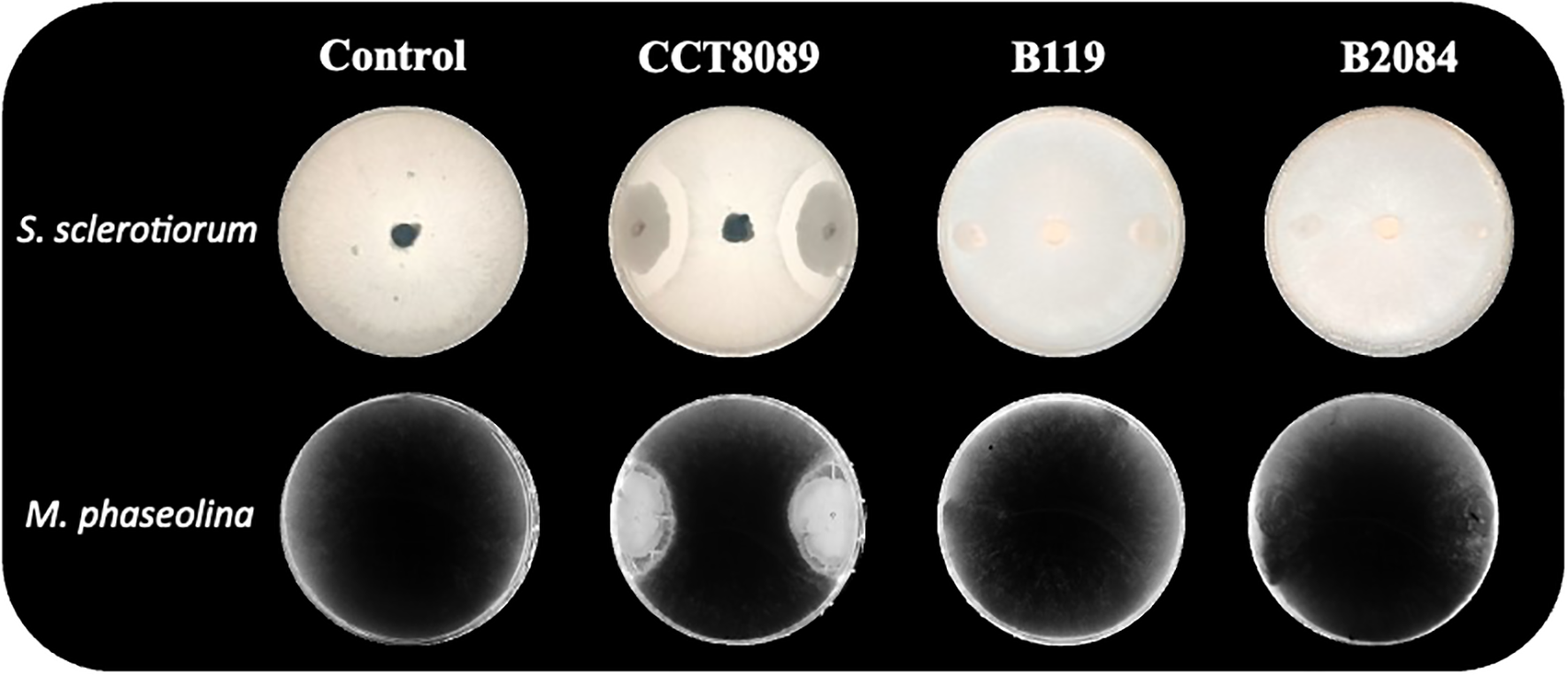 Direct antagonism in dual culture of Bacillus strains (B. siamensis CCT8089, B. subtilis B119, and B. megaterium B2084) and the fungi Sclerotinia sclerotiorum and Macrophomina phaseolina.