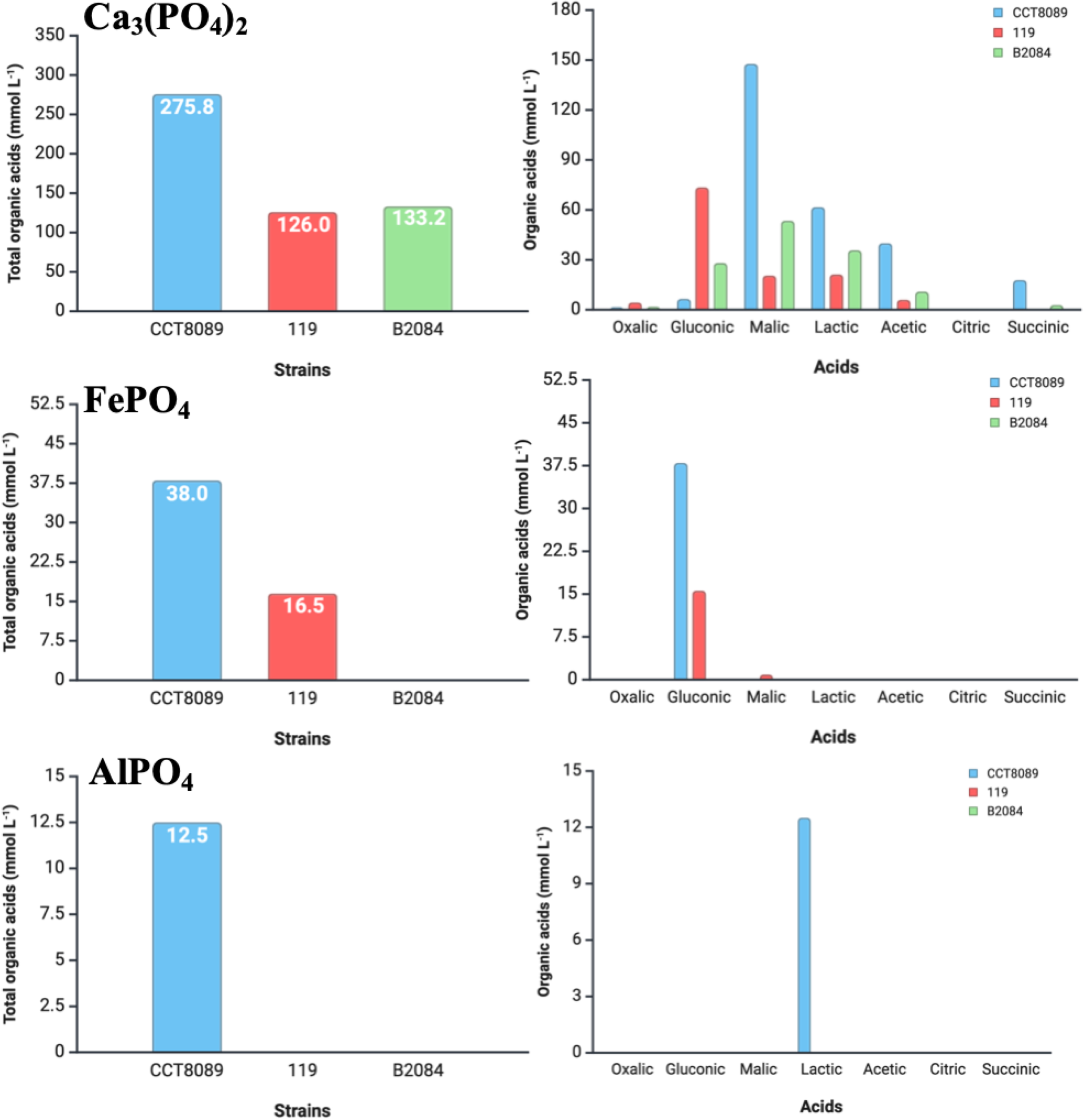 For organic acid production, strains CCT8089, B119, and B2084 exhibited a higher capacity to produce organic acids when using Ca3(PO4)2 as the phosphate source compared to FePO4 and AlPO4 (Figure 3). Strain CCT8089 demonstrated the highest organic acid production capacity, with 275.8, 38.0, and 12.5 mmol L⁻¹ in Ca3(PO4)2, FePO4, and AlPO4, respectively, followed by strain B119, which produced 126.0 and 16.5 mmoL L⁻¹ in Ca3(PO4)2 and FePO4, respectively. Strain B2084 produced 171.0 mmoL L⁻¹ in Ca3(PO4)2, while its organic acid production in FePO4 and AlPO4 was not detectable.