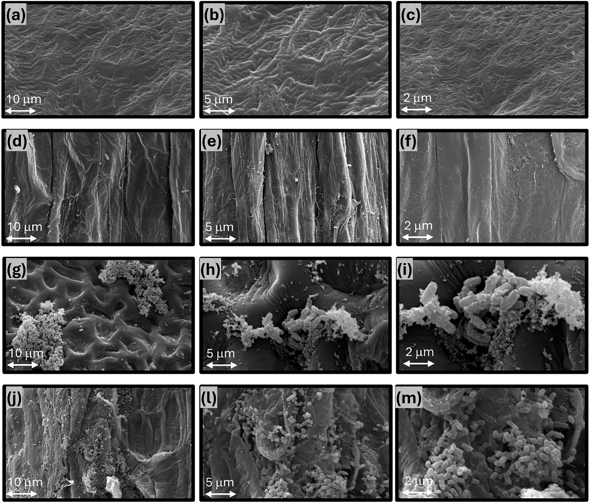 Scanning electron microscopy of soybean seed surfaces and root colonization with and without treatment by Bacillus siamensis CCT8089, with magnifications of 1000x, 3000x, and 7000x, respectively. Panels (a–c) represent the untreated seed, while panels (d–f) show the corresponding untreated roots after seven days of germination. Panels (g–i) display seeds treated with CCT8089 (200 mL/100 kg of seeds) at a concentration of approximately 1 × 109 CFU mL⁻¹, and panels (j–m) show the colonized roots after seven days.