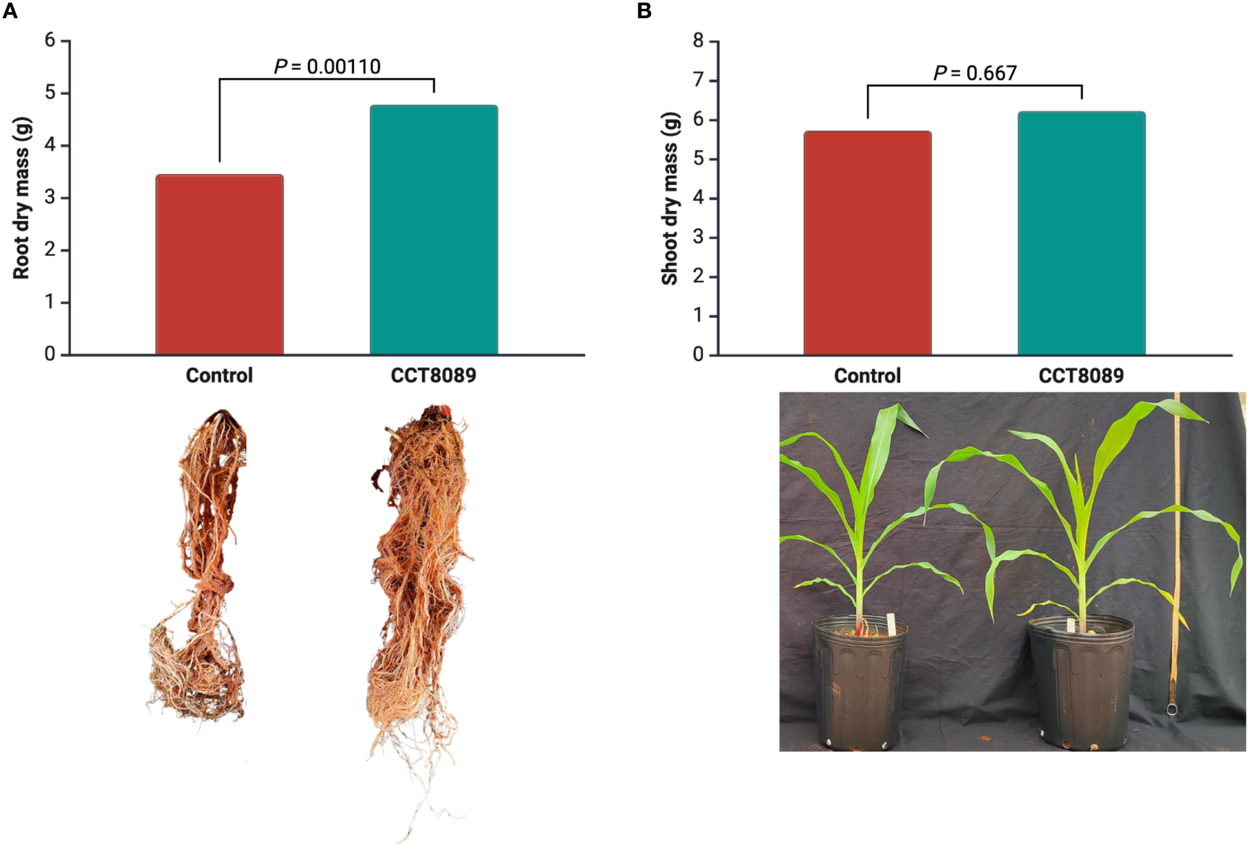 In the greenhouse experiment, strain CCT8089 significantly increased the root dry mass of maize plants compared to the control treatments (Figure 5). Plants inoculated with CCT8089 showed a 38.3% increase in root biomass compared to the non-inoculated control. For shoot dry mass, no significant differences were observed between treatments.