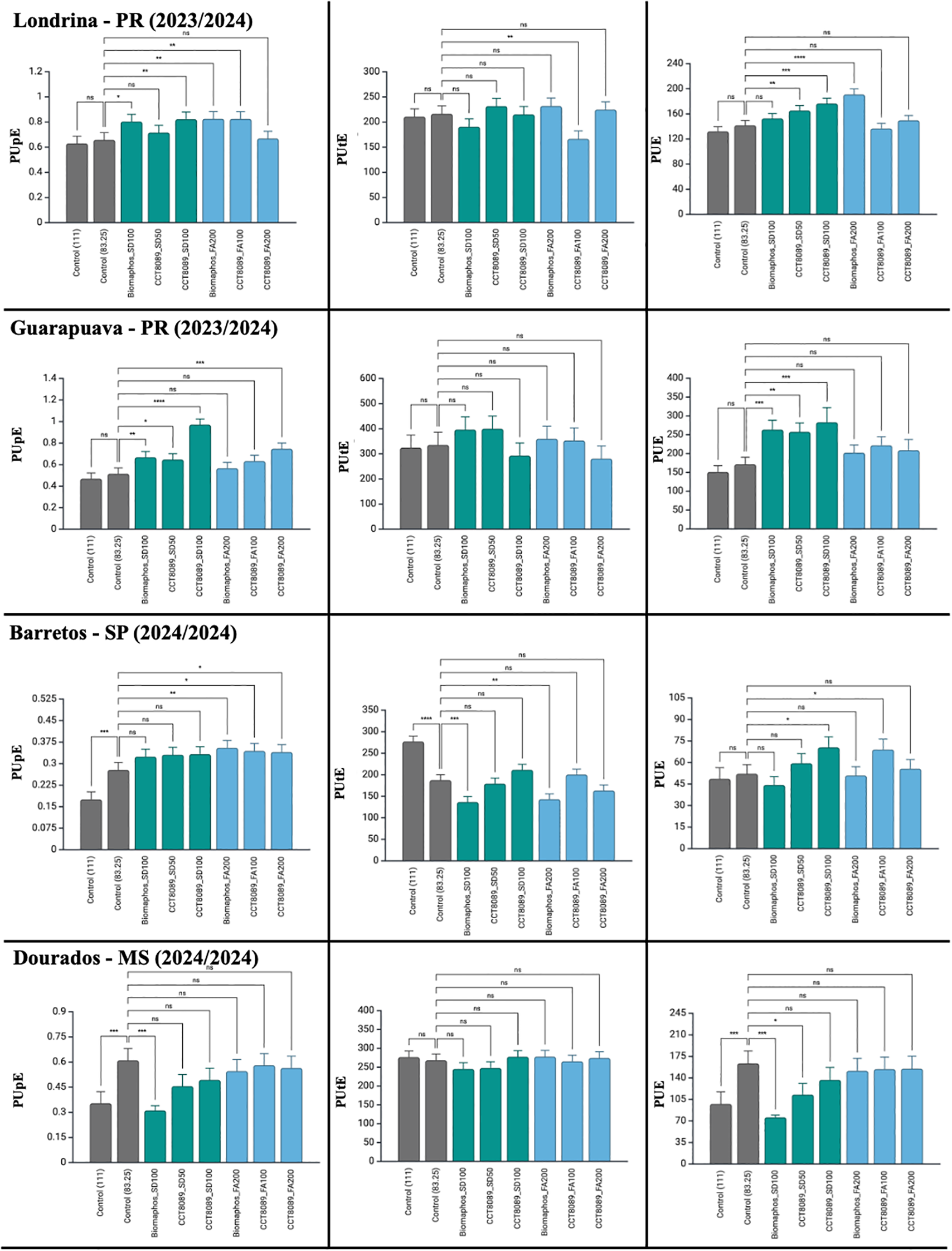 For the maize experiments, five trials were conducted: 1) Londrina – PR (2023/2024 season), 2) Guarapuava – PR (2023/2024 season), 3) Rio Verde – GO (2024/2024 season), 4) Barretos – SP (2024/2024 season), and 5) Dourados – MS (2024/2024 season). For soybean, five trials were conducted: 1) Faxinal – PR, 2) Londrina – PR, 3) Guarapuava – PR, 4) Rio Verde – GO, and 5) Barretos – SP. All soybean experiments were conducted during the 2023/2024 season. Supplementary Table S1 presents the physicochemical soil analyses and other characteristics related to the evaluation sites.