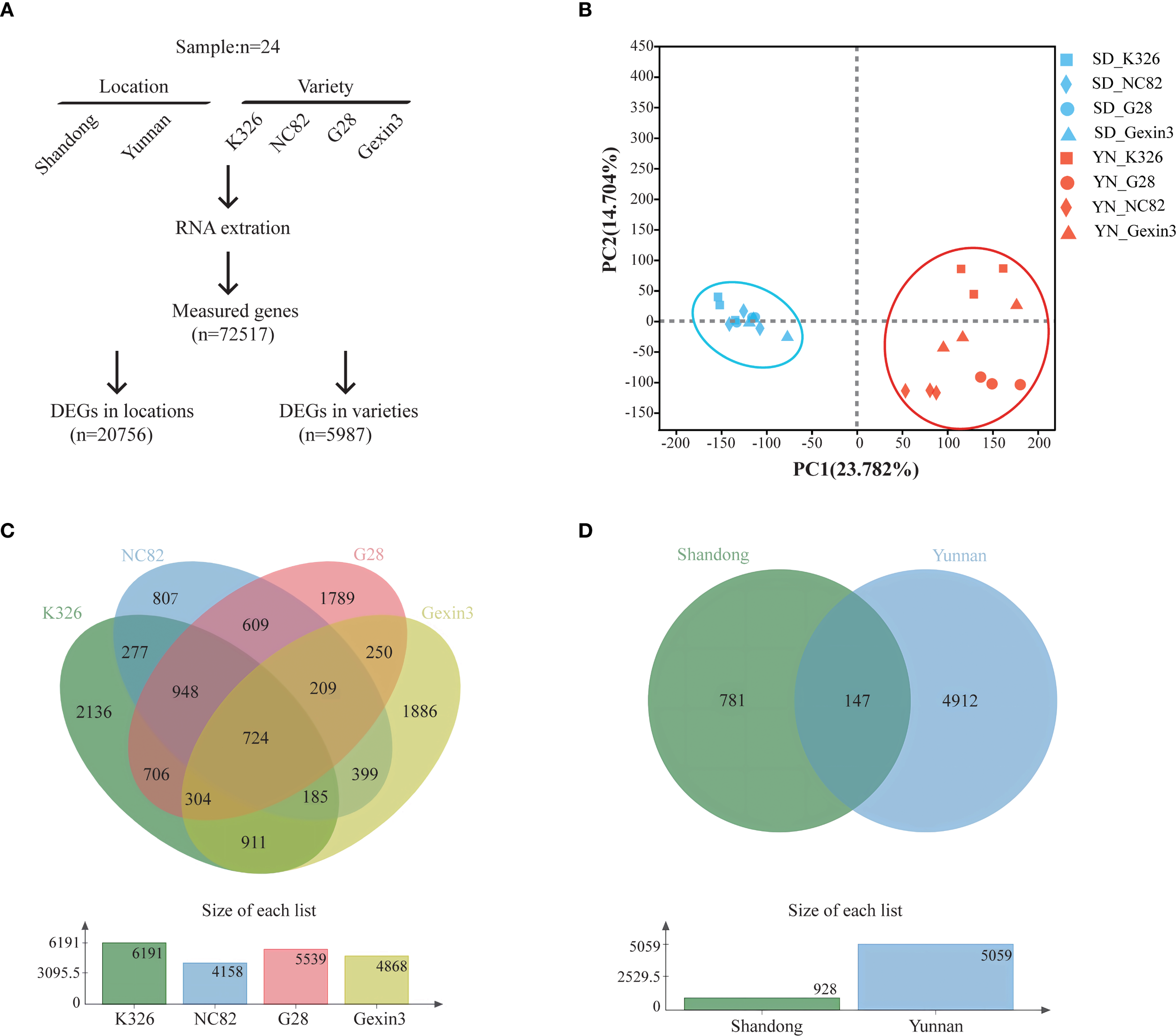 Transcriptome analysis. (A) Diagram showing the identification of differentially expressed genes; (B) Principal component analysis (PCA) of the transcriptomic data; (C) Venn diagram of DEGs in locations; (D) Venn diagram of DEGs in varieties.