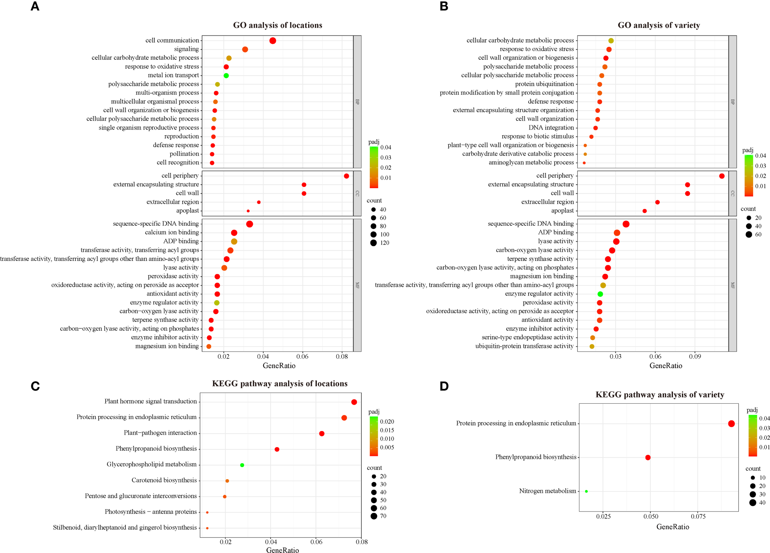 GO and KEGG analysis of DEGs between locations and among varieties. (A) GO analysis of location DEGs; (B) GO analysis of variety DEGs; (C) KEGG analysis of location DEGs; (D) KEGG analysis of variety DEG.
