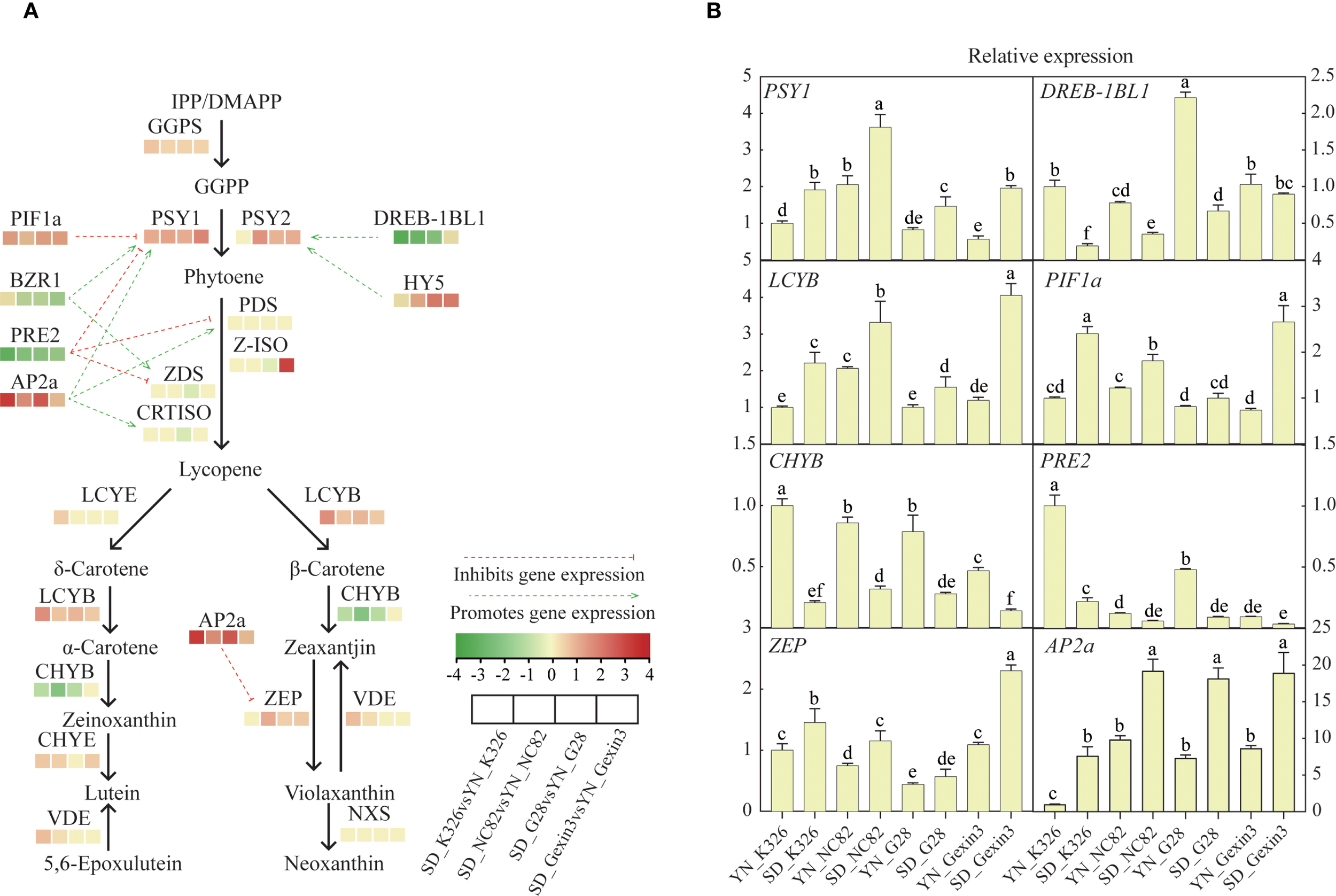 Expression profiling of genes involved in the carotenoid metabolic pathway (A) and qRT-PCR analysis of selected genes (B). GGPS, geranyl diphosphate synthase; PSY, phytoene synthase; PDS, phytoene desaturase; Z-ISO, ζ-carotene isomerase; ZDS, ζ-carotene desaturase; CRTISO, carotenoid isomerase; LCYE, lycopene ϵ-cyclase; LCYB, lycopene β-cyclase; CHYB, β-carotene hydroxylase; CHYE, ϵ- cyclase hydroxylase; VDE, violaxanthin de-epoxidase; ZEP, zeaxanthin epoxidase; NXS, neoxanthin synthase. Values labelled with different letters are statistically different from one another using one-way ANOVA (P < 0.05).