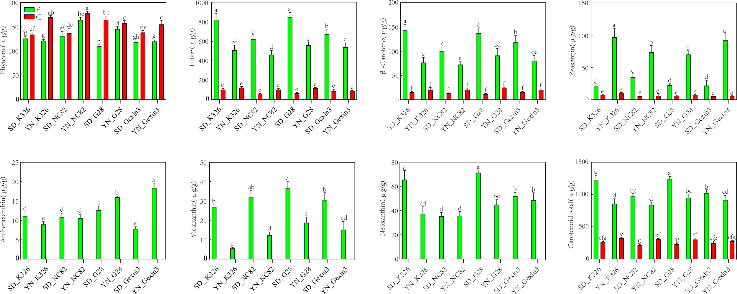 Carotenoid content in fresh (F) and cured (C) tobacco leaves. SD, Shandong; YN, Yunnan. Values labelled with different letters are statistically different from one another using one-way ANOVA (P < 0.05).